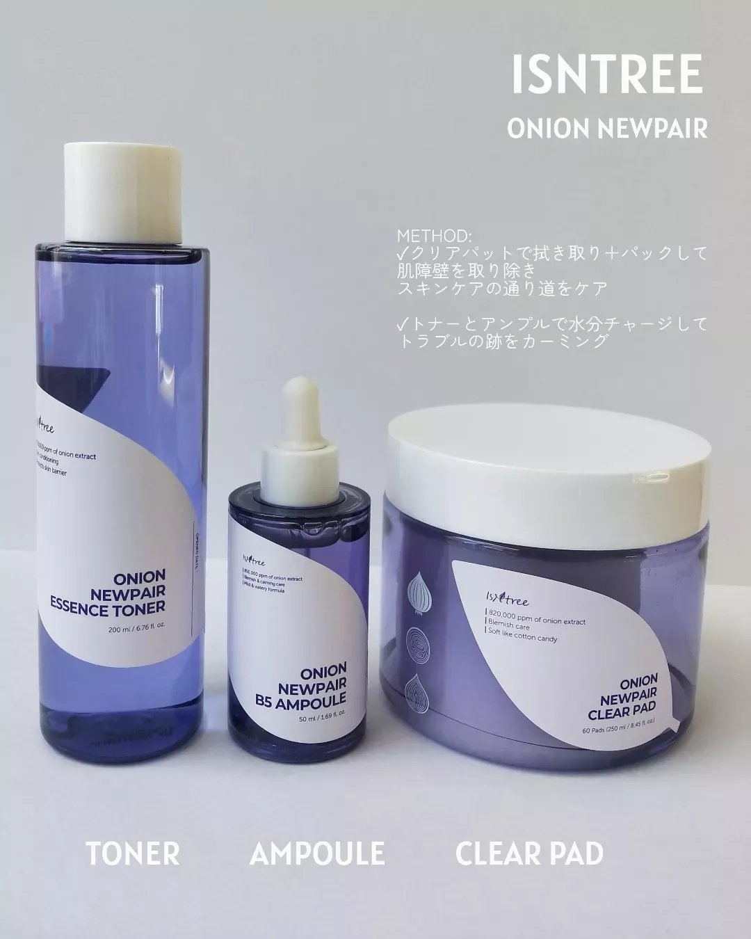 紫玉ねぎエキス85%、パンテノール5% フェルラ酸、カフェイン、トラネキサム酸配合 少しとろみのあるテクスチャーだけどサラッとのびてベタつき感も気にならず!肌トラブルが多い私も安心して使えるアンプル✨ コットン100%刺激のないやわらかいパッド 7種類の跡ケア成分