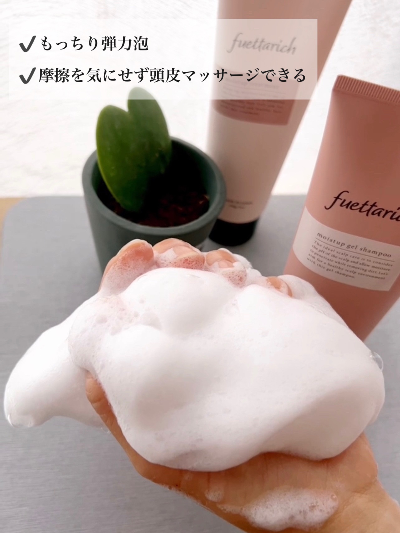 ヘアサロン監修のfuettarich(フエッタリッチ) ✳︎ ジェルタイプのシャンプーははじめて! この濃密ジェルは泡立ちがよくて、頭皮の毛穴にも入り込める微細な泡に変わるから、毛穴の奥からすっきり! 静電気やドライヤーの熱をうるおいに変えてくれるヒートモイスト処方なので、冬でも安心してドライヤーやアイロンが使えます✳︎