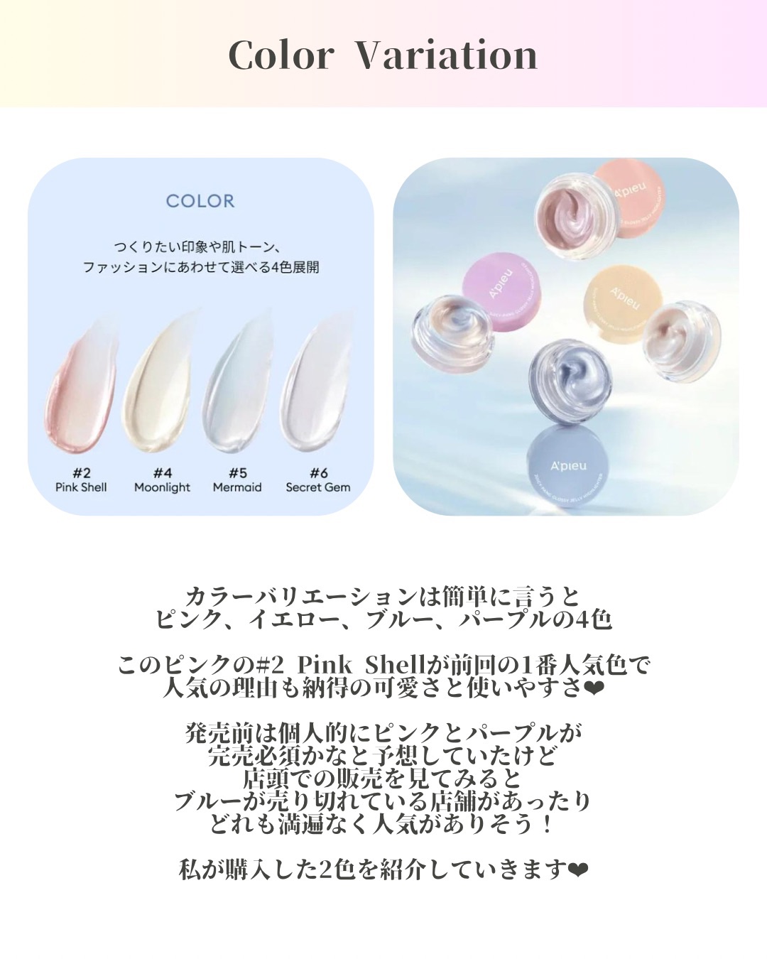 - 神秘的な輝きをとじこめた、人魚の秘密のコレクション。 パールとパステルカラーの輝きをまとう、やわらかジェルのカラーハイライターが新色とともに再登場。 透明感が美しいジェルタイプならではの輝きとトレンドカラーを落とし込んだ、神秘的な「マーメイド」の世界観で、新色と再販の人気No1カラーを展開します。 ●つくりたい印象や肌トーン、ファッションで選べる4色展開 …貝殻のようなピンクカラー、月の光のようなシャンパンカラー、人魚の鱗のような偏光ブルーカラー、宝石のようなアメジストカラー ●やわらかジェルだから様々なパーツに♡ …Cゾーン、おでこ、目元・鼻先、リップの山、デコルテ、肩、耳たぶに。 アルコールFREE、ミネラルオイルFREE、パラベンFREE、合成着色料FREE