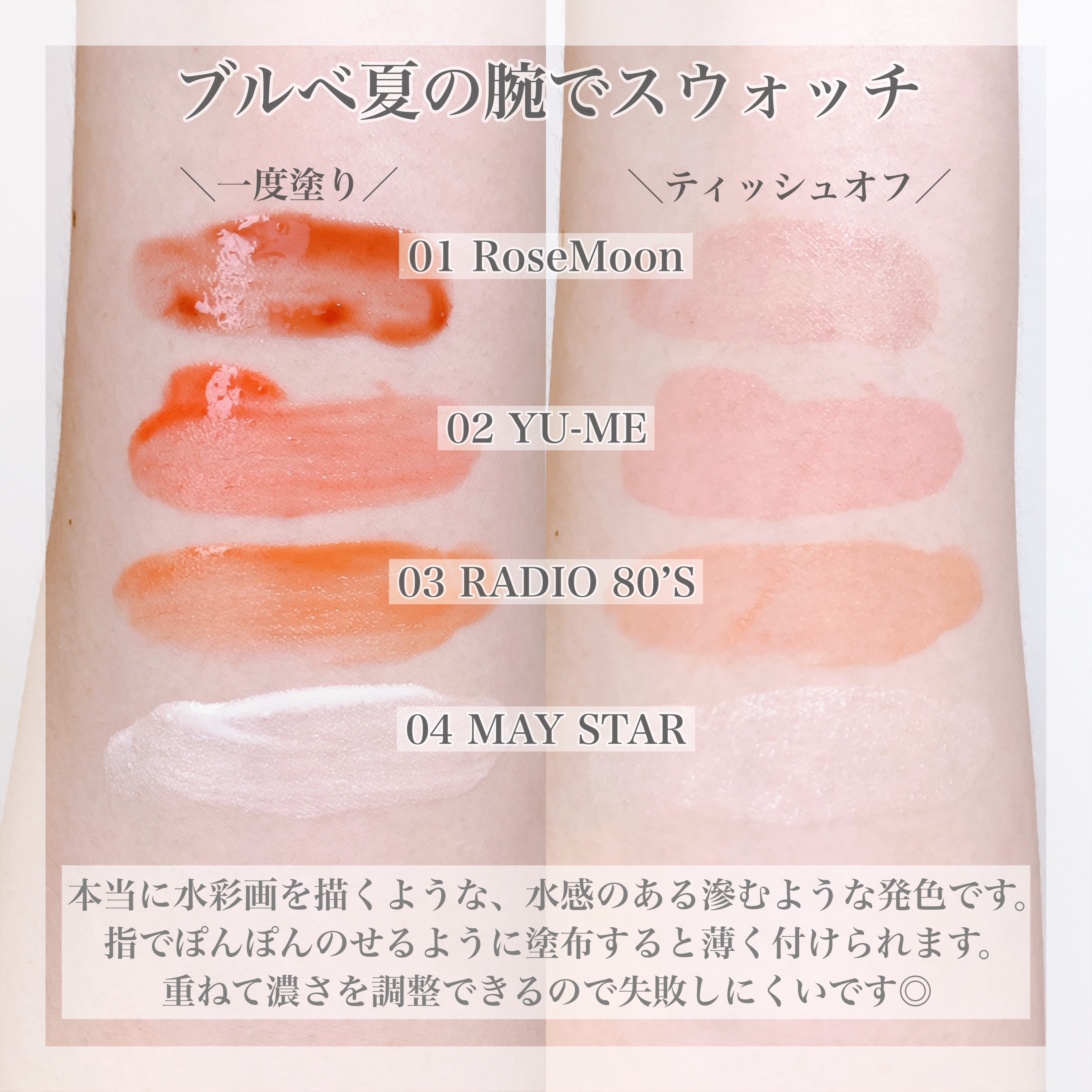 - <01 Rose Moon> 水、メチルトリメチコン、ジメチコン、エチルヘキサン酸セチル、イソノナン酸イソノニル、エタノール、ポリブテン、グリセリン、PEG-10ジメチコン、ペンチレングリコール、(ビニルジメチコン/メチコンシルセスキオキサン)クロスポリマー、1,2-ヘキサンジオール、加水分解フィブロイン、グリセリルグルコシド、ビスジグリセリルポリアシルアジペート-2、ジステアルジモニウムヘクトライト、硫酸Mg、マイカ(CI77019)、酸化チタン(CI77891)、酸化鉄(CI77491)、グンジョウ(CI77007)、赤226(CI73360)、酸化鉄(CI77492)、酸化鉄(CI77499)、BG、トリエトキシカプリリルシラン、オキシ水酸化Al、セチルPEG/PPG-10/1ジメチコン、クワ葉エキス、エチルヘキシルグリセリン、エチレンジアミンジコハク酸3Na <02 YU-ME> 水、メチルトリメチコン、ジメチコン、エチルヘキサン酸セチル、イソノナン酸イソノニル、エタノール、ポリブテン、グリセリン、PEG-10ジメチコン、ペンチレングリコール、(ビニルジメチコン/メチコンシルセスキオキサン)クロスポリマー、1,2-ヘキサンジオール、加水分解フィブロイン、グリセリルグルコシド、ビスジグリセリルポリアシルアジペート-2、ジステアルジモニウムヘクトライト、硫酸Mg、マイカ(CI77019)、赤226(CI73360)、酸化チタン(CI77891)、酸化鉄(CI77492)、酸化鉄(CI77491)、グンジョウ(CI77007)、酸化鉄(CI77499)、BG、トリエトキシカプリリルシラン、オキシ水酸化Al、セチルPEG/PPG-10/1ジメチコン、マグワ葉エキス、エチルヘキシルグリセリン、エチレンジアミンジコハク酸3Na <03 Radio 80’s > 水、メチルトリメチコン、ジメチコン、エチルヘキサン酸セチル、イソノナン酸イソノニル、エタノール、ポリブテン、グリセリルグルコシド、PEG-10ジメチコン、1,2-ヘキサンジオール、グリセリン、(ビニルジメチコン/メチコンシルセスキオキサン)クロスポリマー、ペンチレングリコール、BG、加水分解フィブロイン、ジステアルジモニウムヘクトライト、ビスジグリセリルポリアシルアジペート-2、硫酸Mg、酸化チタン(CI77891)、酸化鉄(CI77491)、酸化鉄(CI77499)、セチルPEG/PPG-10/1ジメチコン、クワ葉エキス、エチルヘキシルグリセリン、エチレンジアミンジコハク酸3Na <04 May Star> 水、メチルトリメチコン、ジメチコン、エチルヘキサン酸セチル、イソノナン酸イソノニル、エタノール、ポリブテン、グリセリルグルコシド、PEG-10ジメチコン、1,2-ヘキサンジオール、グリセリン、(ビニルジメチコン/メチコンシルセスキオキサン)クロスポリマー、ペンチレングリコール、BG、加水分解フィブロイン、ジステアルジモニウムヘクトライト、ビスジグリセリルポリアシルアジペート-2、硫酸Mg、酸化チタン(CI77891)、酸化鉄(CI77492)、酸化鉄(CI77491)、酸化鉄(CI77499)、セチルPEG/PPG-10/1ジメチコン、クワ葉エキス、エチルヘキシルグリセリン、エチレンジアミンジコハク酸3Na