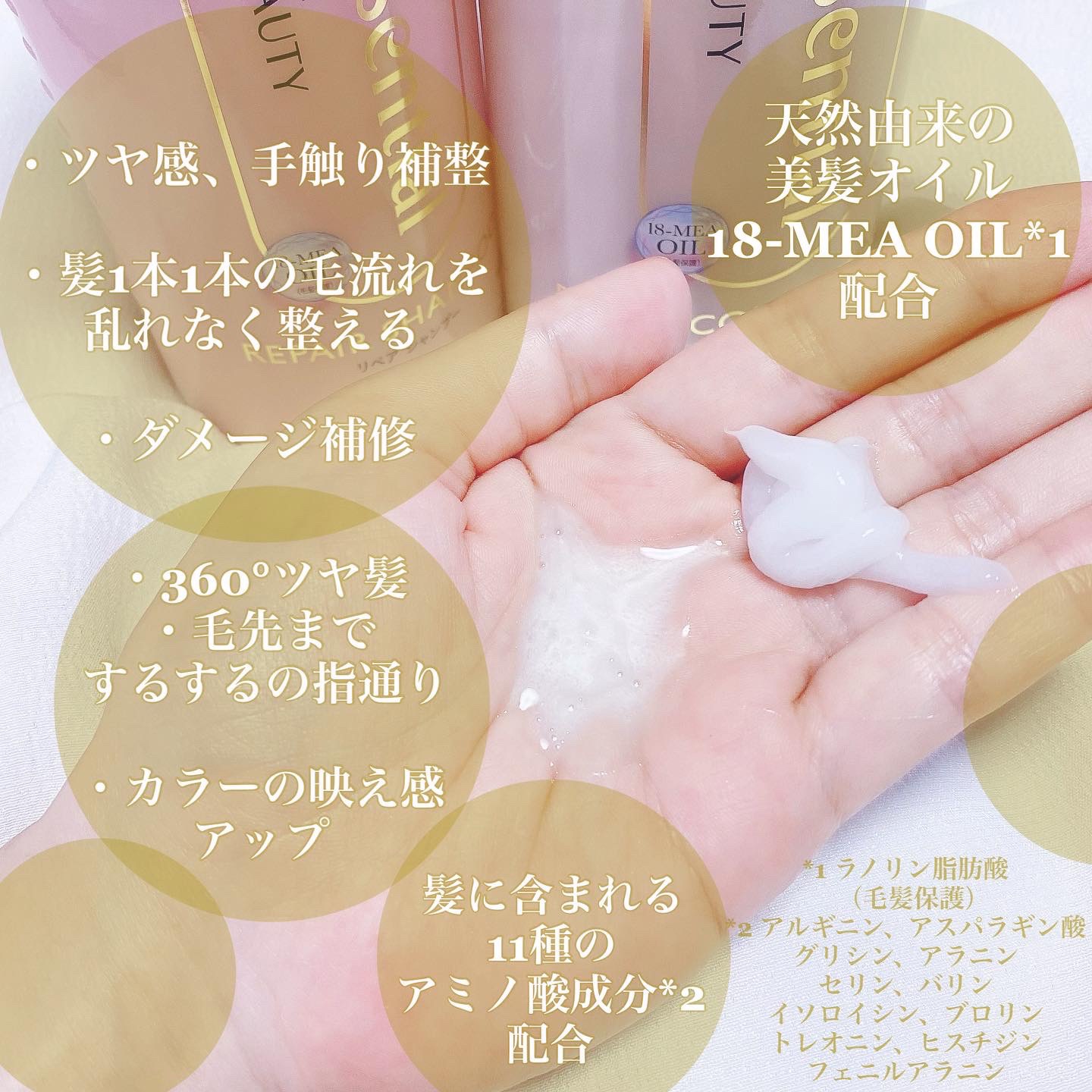 - パサつきやダメージによる、からまりが気になる髪に、 美髪のベースメイク処方のリペアシャンプー&コンディショナー。 毛流れを整え、ツヤ感や手触りを補整し、感動のうるサラ髪へ。 毛流れが整うと、いいことがたくさん♪ ✓毛先までするするの指通り ✓ツヤ感 ✓カラーの映え感UP ✓寝ぐせつきにくい ✓ドライヤーで乾かしやすい ✓朝、手ぐしでまとまる ✓アイロンの形づきUP ✓毛先までうるおい感UP こだわりの美髪成分配合で、髪内部とキューティクルをW補修。 ✓髪に含まれる11種のアミノ酸成分配合(補修:アルギニン、アスパラギン酸、グリシン、アラニン、セリン、バリン、イソロイシン、プロリン、トレオニン、ヒスチジン、フェニルアラニン) ✓天然由来の美髪オイル[18-MEA OIL*(毛髪保護:ラノリン脂肪酸)]配合。 *髪に0.1%未満しかなく、ツヤめきや指通りの良さに必須の成分です。 ✿フローラルリュクスの香り