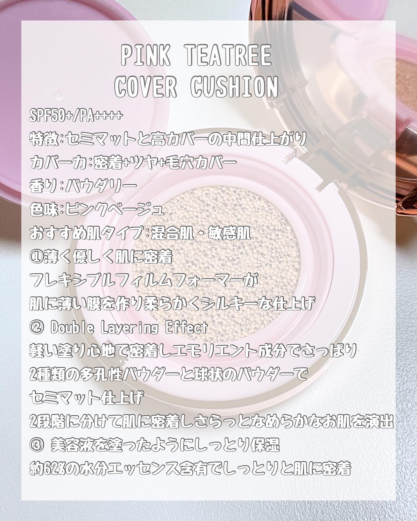 混合肌や敏感肌におすすめのピンクティーツリーカバープライマークッション カラーは『21号』を使用しました! SPF50+ PA++++の高UVカットのクッションファンデーション うるおい感がありながら、ピタッと肌に密着してくれるテクスチャ