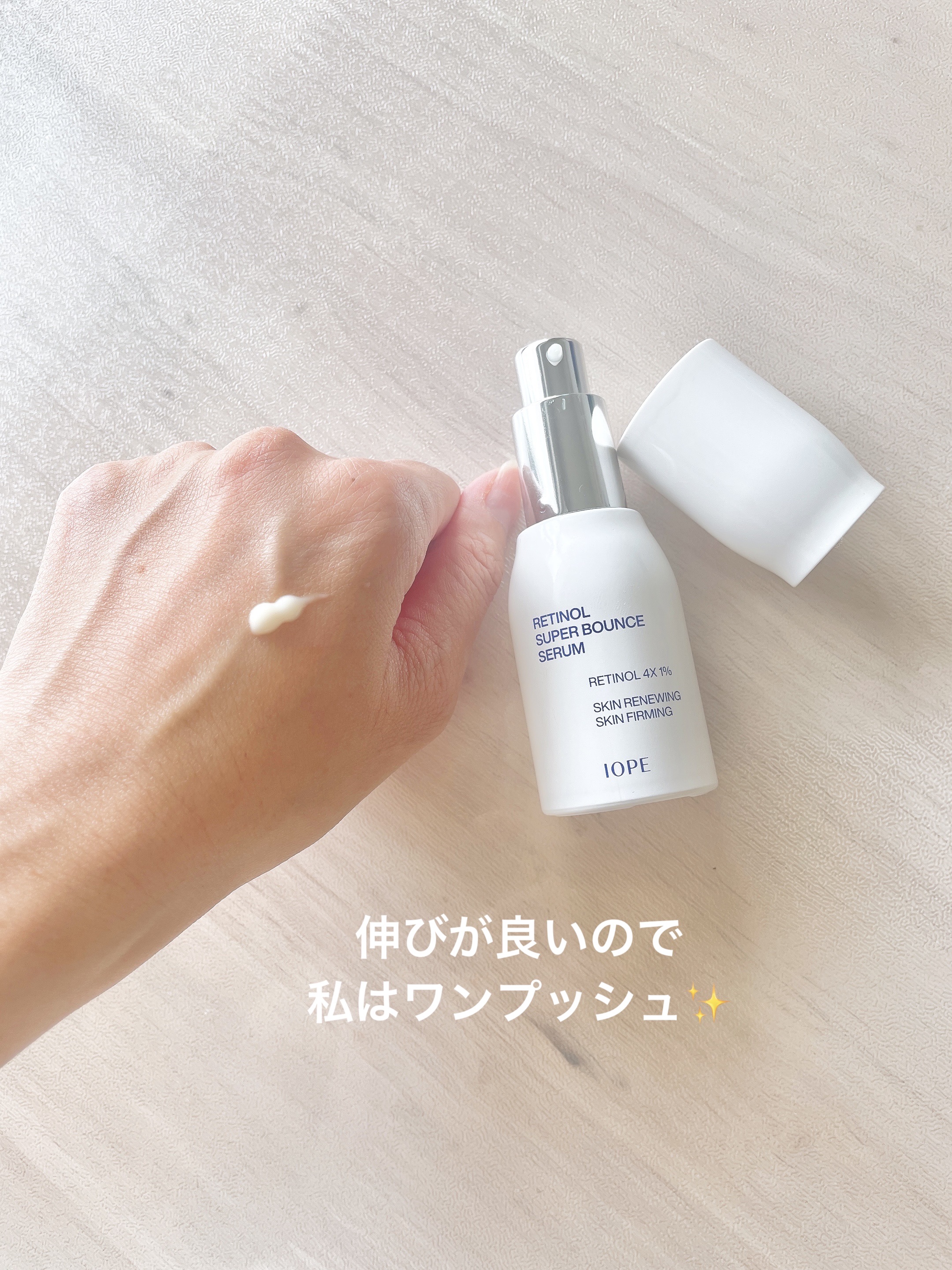 今話題のレチノールスーパーバウンスセラム。朝、夜と使えるレチノールなの♡ 4重の弾力レイヤリングで内側から満たされる、低刺激・密度ハリセラム♡ レチノール4Xマルチチューン™1%配合で4種のレチノール&レチノイドが順次活性化して層ごとに密度の高いハリケアができちゃうんだ! みずみずしいテクスチャーのセラム。伸びも良くて、角質層への馴染みも早い印象が♡ これから7日間使ってどんなお肌になるかとても楽しみ♬