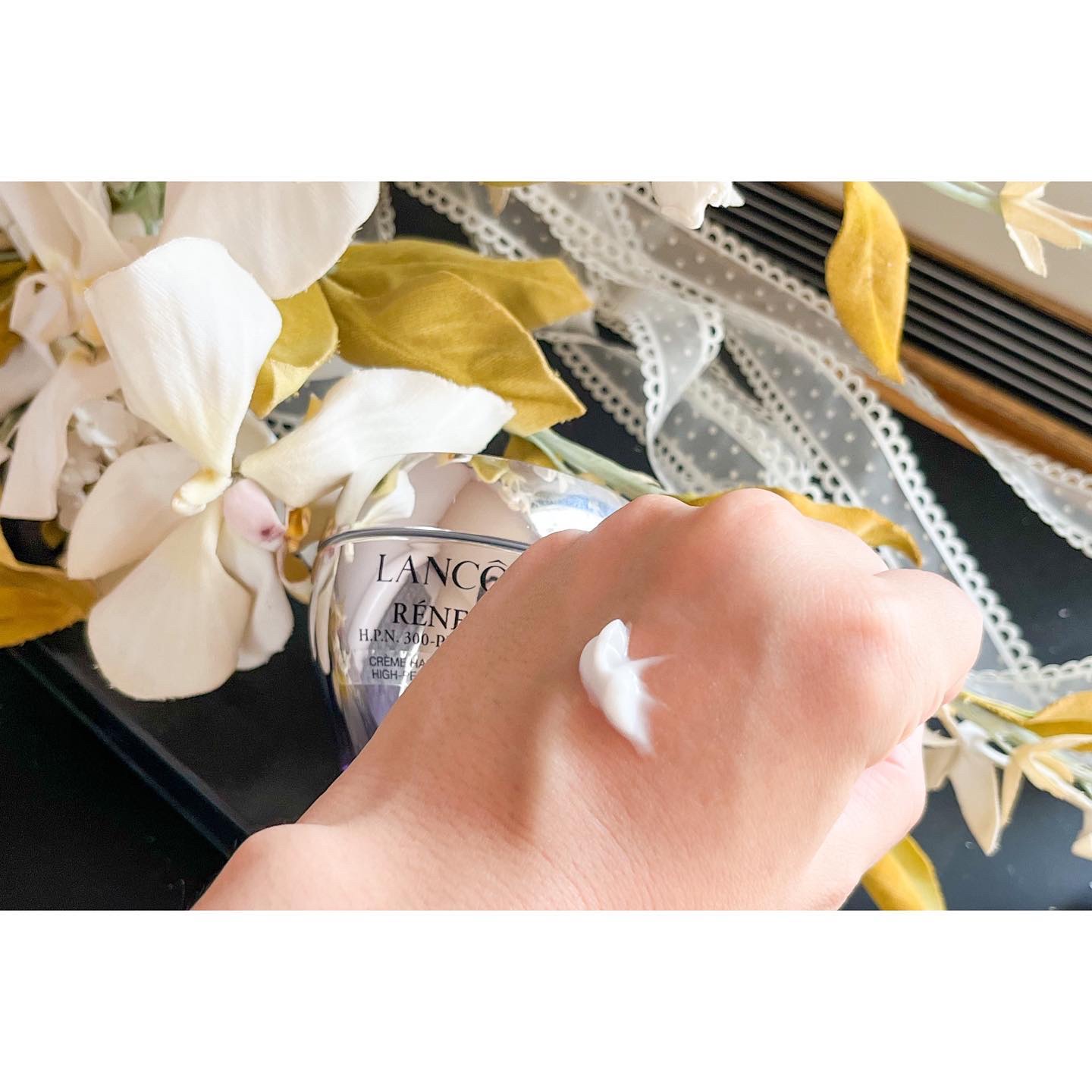 肌再生科学に着想を得て生まれた先進的なクリームと言うHPNクリーム。 先進的なフォーミュラにはヒアルロン酸※1、ナイアシンアミド※2、さらにランコム初となる300種を超えるペプチド※3の恵みを配合しているんですって! ランコムのヒアルロン酸は、お肌への浸透力が高く肌荒れへの効果も期待できるのだそう♪ 高級感のあるボトルに詰まった濃密なクリーム。 こっくりとした存在感のあるクリーム♡ 濃密ながらも伸びが良くさらっとした仕上がりが嬉しいところ。 少しづつ涼しくなってくるにつれて、これからは乾燥が気になるシーズンの到来。 ワンランク上のスキンケアでしっかりとお手入れしていきたいと思います𖧷