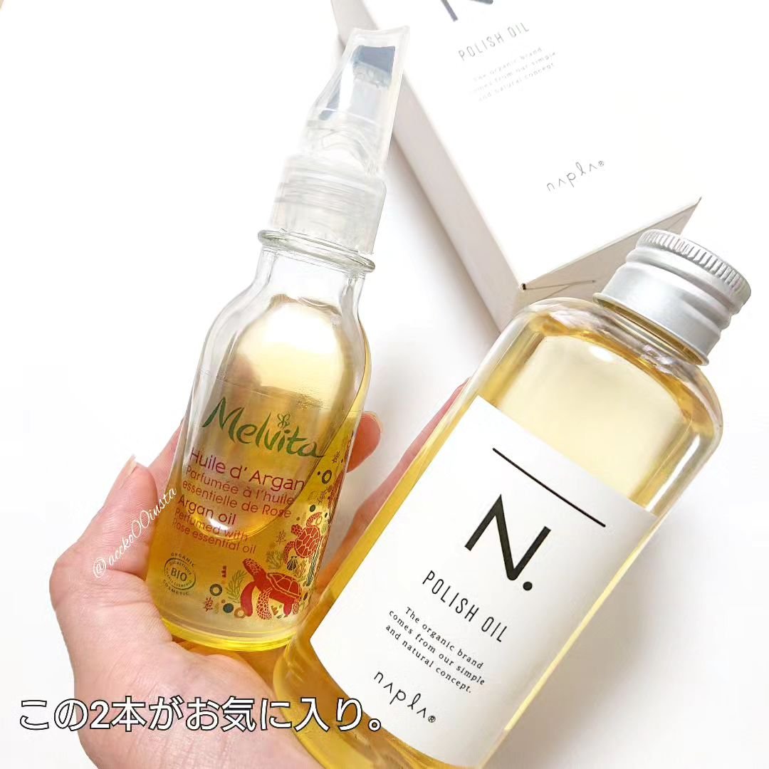 N.ポリッシュオイルは、シアバターなどの天然由来成分だけで作られた、肌にも使えるマルチユースなオイル系スタイリング剤。 髪にウェットな質感とツヤを与え、一日ロングキープしてくれるよ🧚✨ マンダリンオレンジ&ベルガモットの柑橘系の香りで癒されながらケアできるのも嬉しい🍊