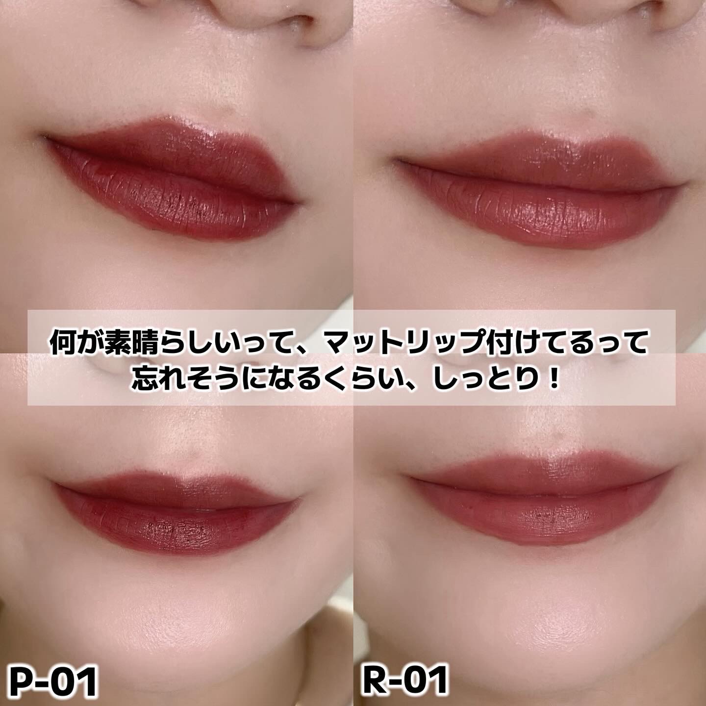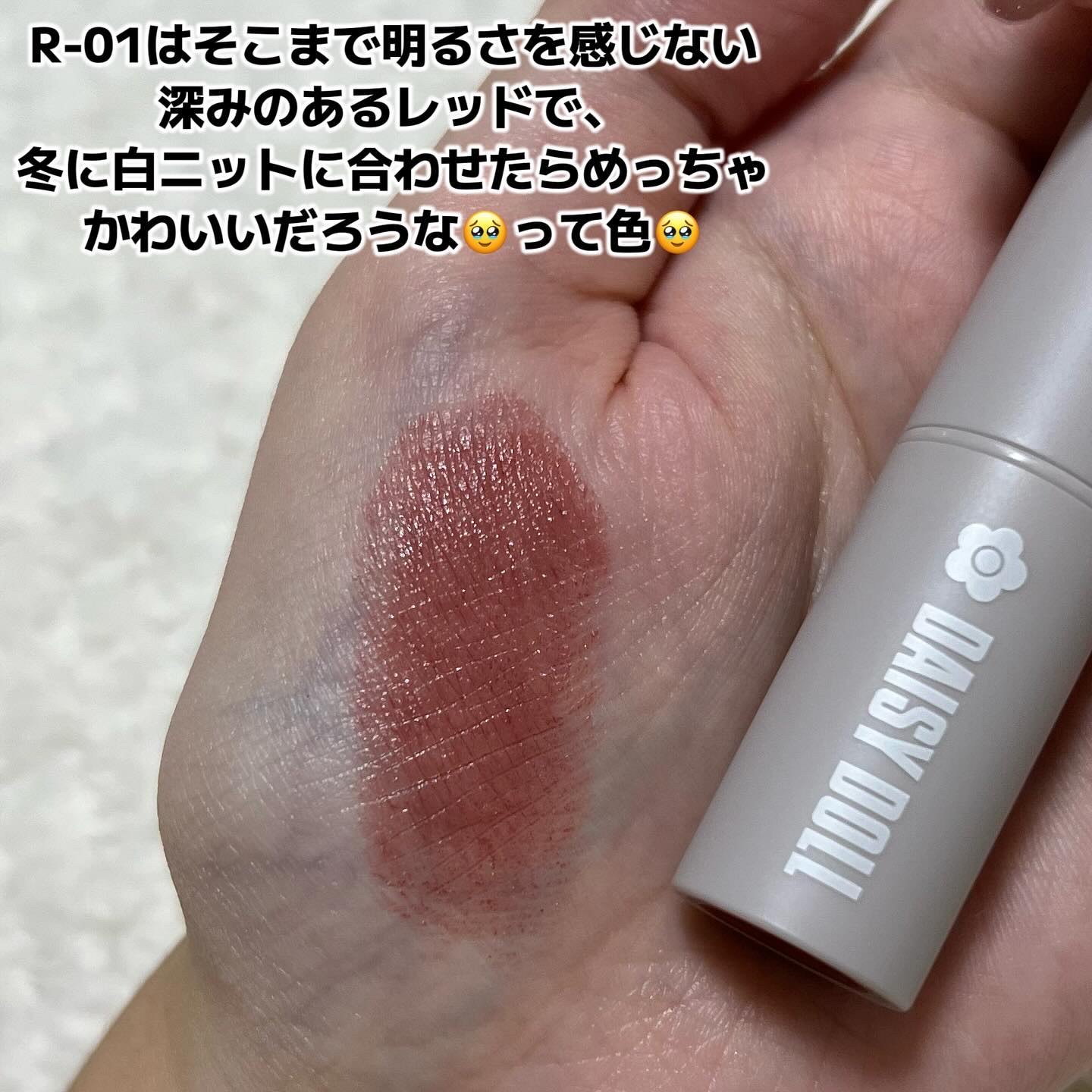 スルっと塗れる柔らかめな質感 乾燥しにくいですが、何度も塗り直す場合は保湿した方がいいと思います…! ソフトマットな仕上がりで、マットリップ苦手でも使いやすそうです◎ R-01は柔らかいレッドブラウン カラバリはくすんだ色が多く、おしゃれな色ばかりなのでおすすめです☻