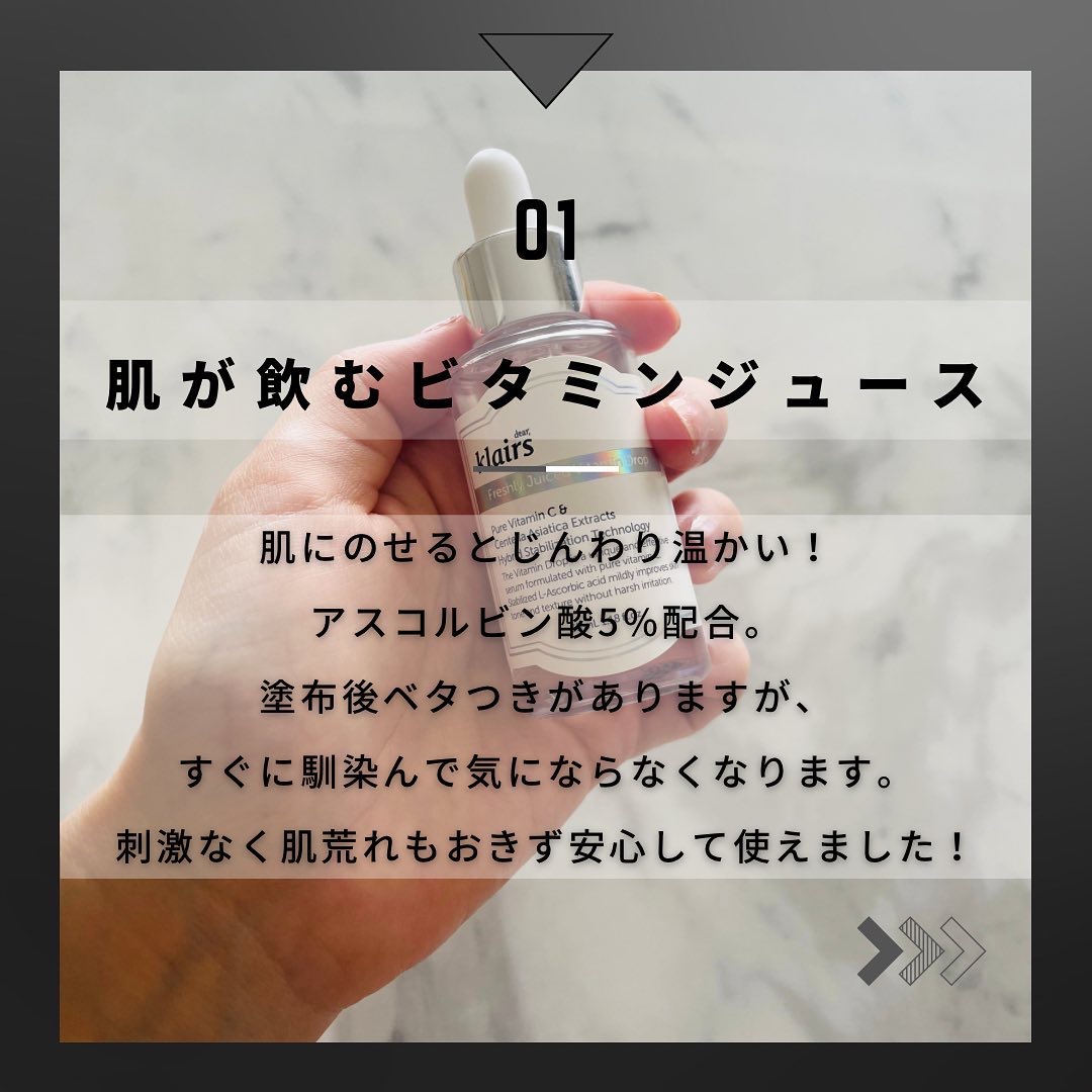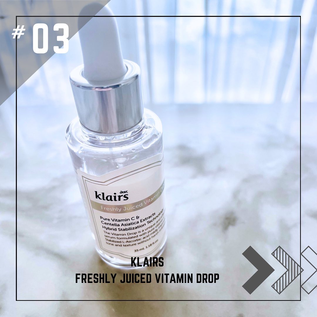 肌が飲むビタミンジュースと呼ばれてる Freshly Juiced Vitamin Drop𓂃٭𓈒𓏸 累計300万本売れた klairsを代表するビタミンセラム💛 ビタミンCといえば刺激が強く感じる方も多いけど、このセラムはビタミンCと保湿成分を適切な比率で配合していて初心者でも使いやすい商品になってるみたい♡⃜ 塗るとぽわ~んと温かさを感じるんだけどこれは肌に浸透にしてPHが正常に整っている証拠なんだって✨