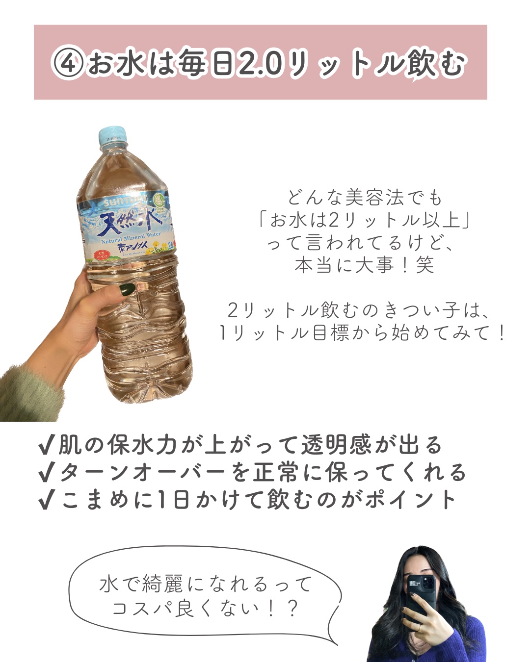 体重(kg)×年齢別必要量(ml)=必要水分量 【年齢別必要量】 30歳未満・・・40ml 30~55歳・・・35ml 56歳以上・・・30ml 年齢と体重によって水分の理想の摂取量はかわりますよー。あと食事のお味噌汁とかの水分も含めてなのでそこも書いてあるといいなぁ。 体重50キロもあってやっと2リットルだよ?? あとトランシーノってニキビ治すというよりシミを消したり予防したい人が使うやつだよ笑。美白アイテムだよ? って隣の人が言ってるわ。