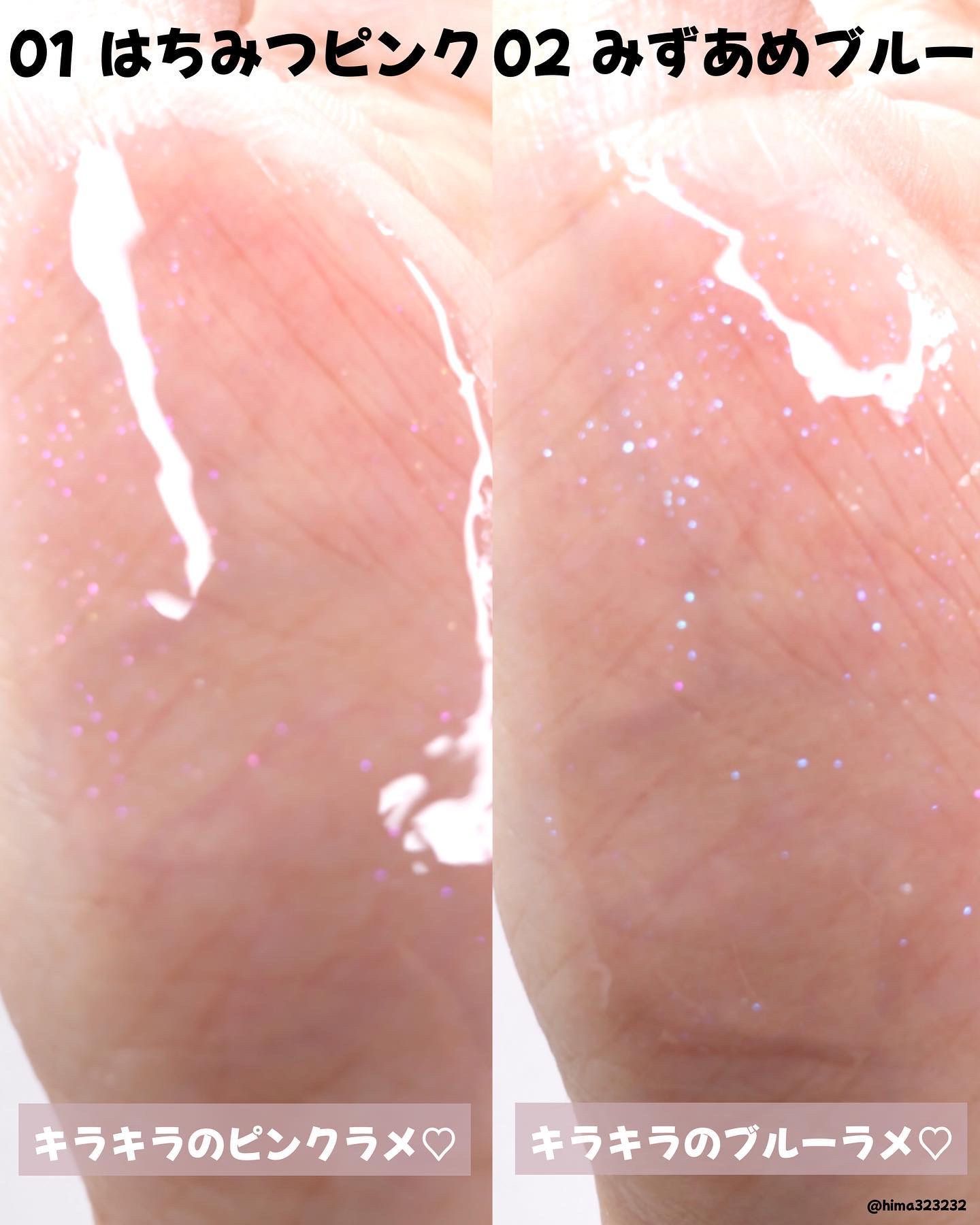 - <01 はちみつピンク> 水添ポリイソブテン、リンゴ酸ジイソステアリル、オクチルドデカノール、トリ(カプリル酸/カプリン酸)グリセリル、リンゴ酸ジイソステアリル、ヒドロキシステアリン酸エチルヘキシル、ジメチルシリル化シリカ、メントキシプロパンジオール、1,2-ヘキサンジオール、パルミチン酸デキストリン、ジブチルラウロイルグルタミド、ジブチルエチルヘキサノイルグルタミド、バニリルブチル、香料、ホウケイ酸(Ca/Al)、酸化チタン、酸化スズ、リンゴ酸ジイソステアリル、青1、赤202、アルガニアスピノサ核油、オリーブ果実油、ヒマシ油、オリーブ油脂肪酸ソルビタン、ヒアルロン酸Na、カプロン酸 <02 みずあめブルー> 水添ポリイソブテン、リンゴ酸ジイソステアリル、オクチルドデカノール、トリ(カプリル酸/カプリン酸)グリセリル、リンゴ酸ジイソステアリル、ヒドロキシステアリン酸エチルヘキシル、ジメチルシリル化シリカ、メントキシプロパンジオール、1,2-ヘキサンジオール、パルミチン酸デキストリン、ジブチルラウロイルグルタミド、ジブチルエチルヘキサノイルグルタミド、香料、バニリルブチル、ホウケイ酸(Ca/Al)、酸化チタン、酸化スズ、リンゴ酸ジイソステアリル、青1、アルガニアスピノサ核油、オリーブ果実油、ヒマシ油、オリーブ油脂肪酸ソルビタン、ヒアルロン酸Na、カプロン酸