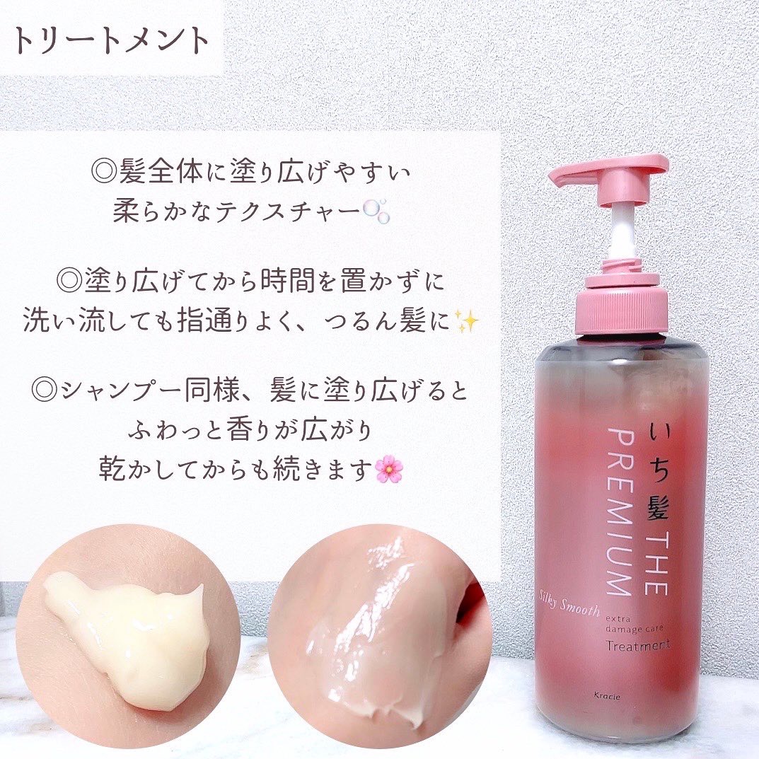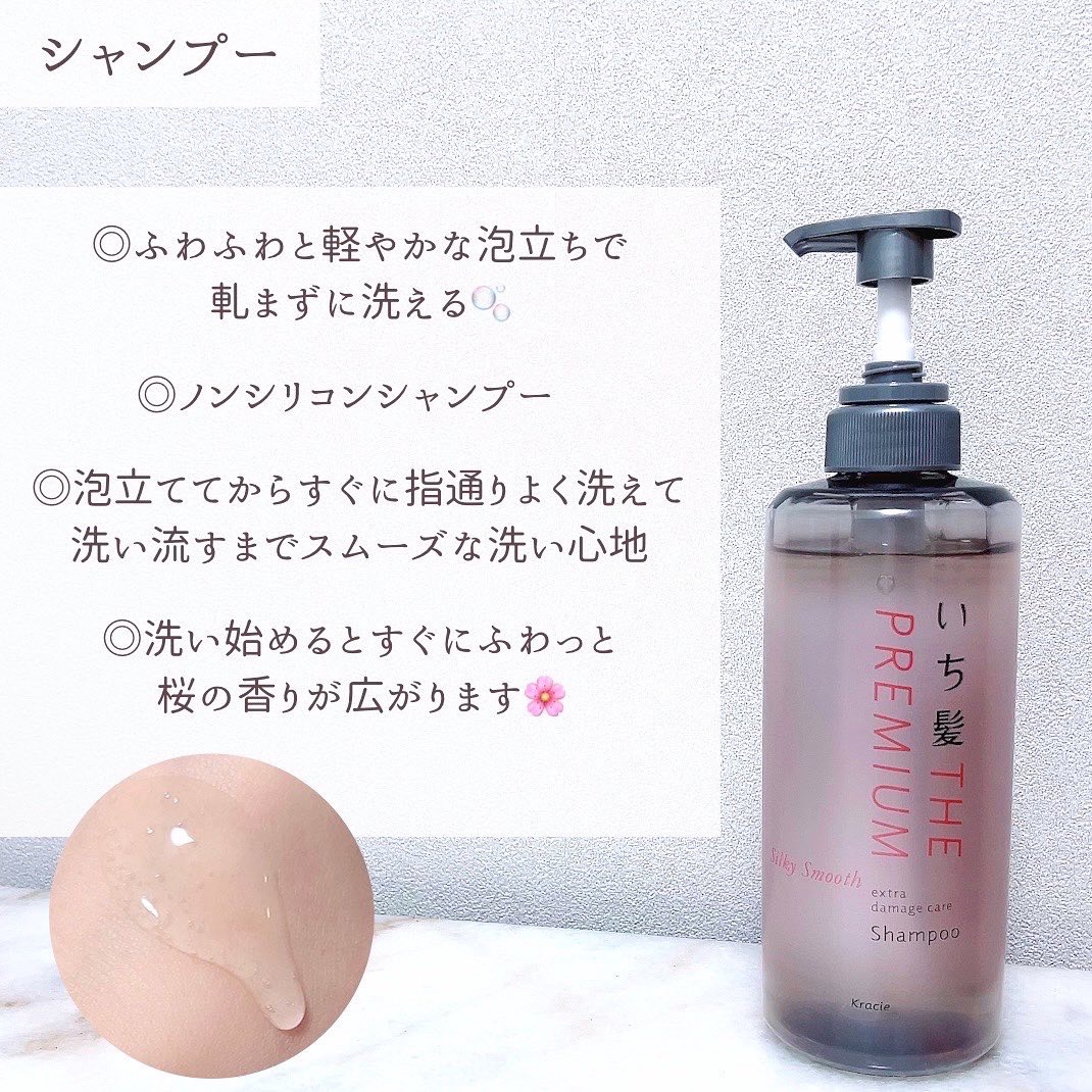 しっとり艶髪に🫧上品な八重桜の香りのいち髪 THE PREMIUM エクストラダメージケア🌸 米ぬか発酵導入美容液(集中補修成分)と源泉和漢エキス(指通り&艶UP成分)が空洞化した髪内部を集中して補修してくれるいち髪premium✨✨ シャンプーの泡立ちはかなり良くふわふわの泡が簡単にできました!🫧