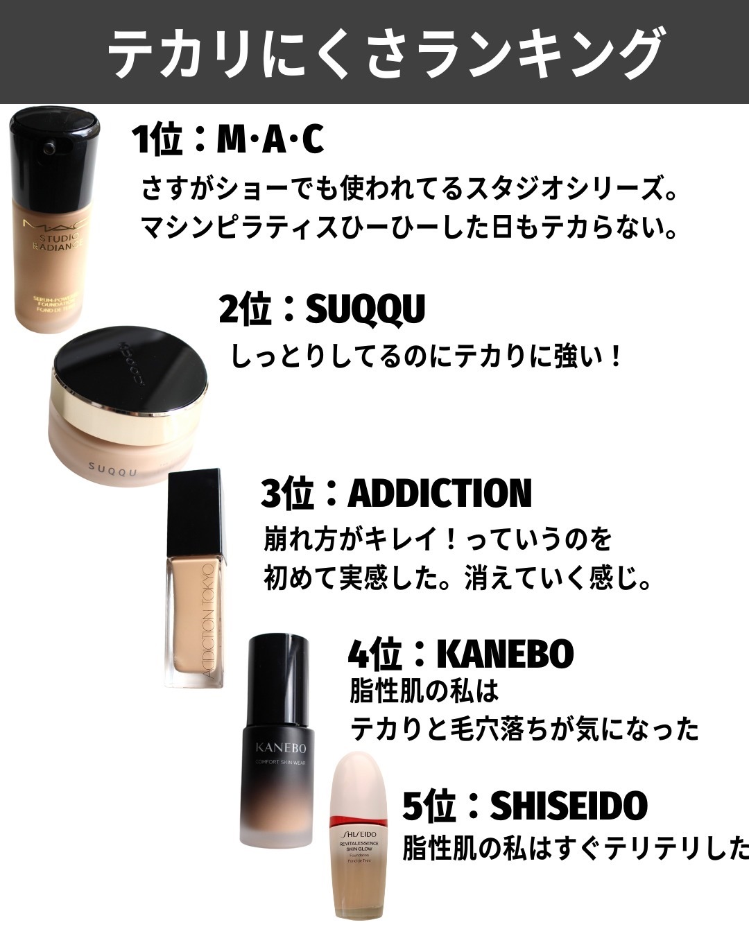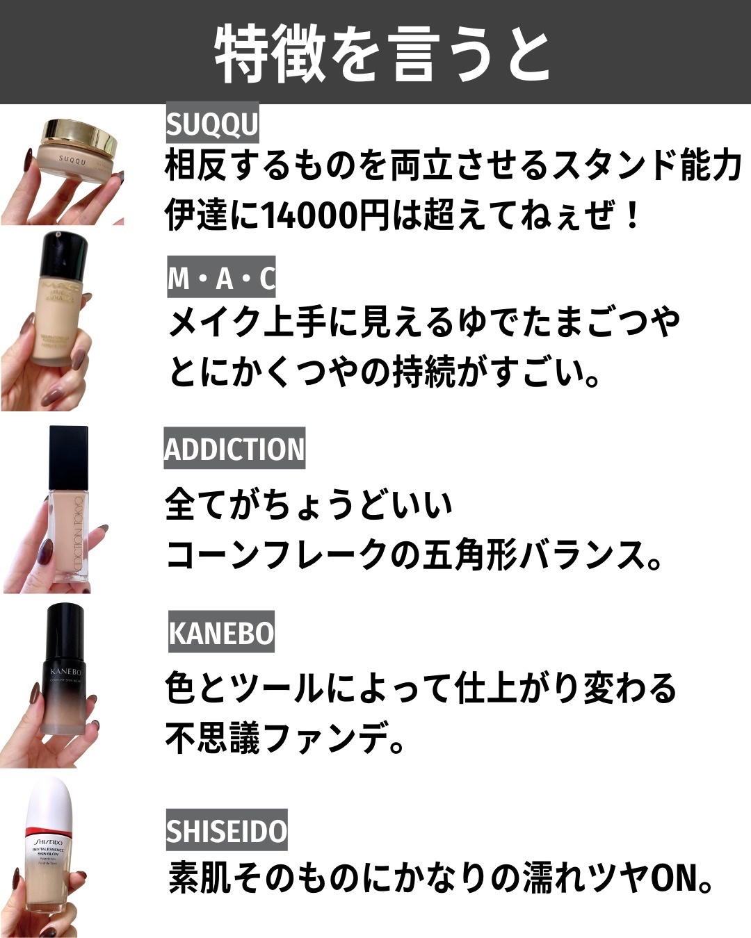 ファンデーションに美容液が入ってるんじゃない。 美容液が、ファンデーションを包み込んでる! たしかに洗顔後の顔の イキイキ度がエグい。 私と逆の 乾燥肌 コンシーラー特に使わない ナチュラルメイク派 素肌感が好き で、無類のつや肌好きで 部分的じゃなくて全体的に濡れつやにしたいなら バッチリ合うと思うよ。