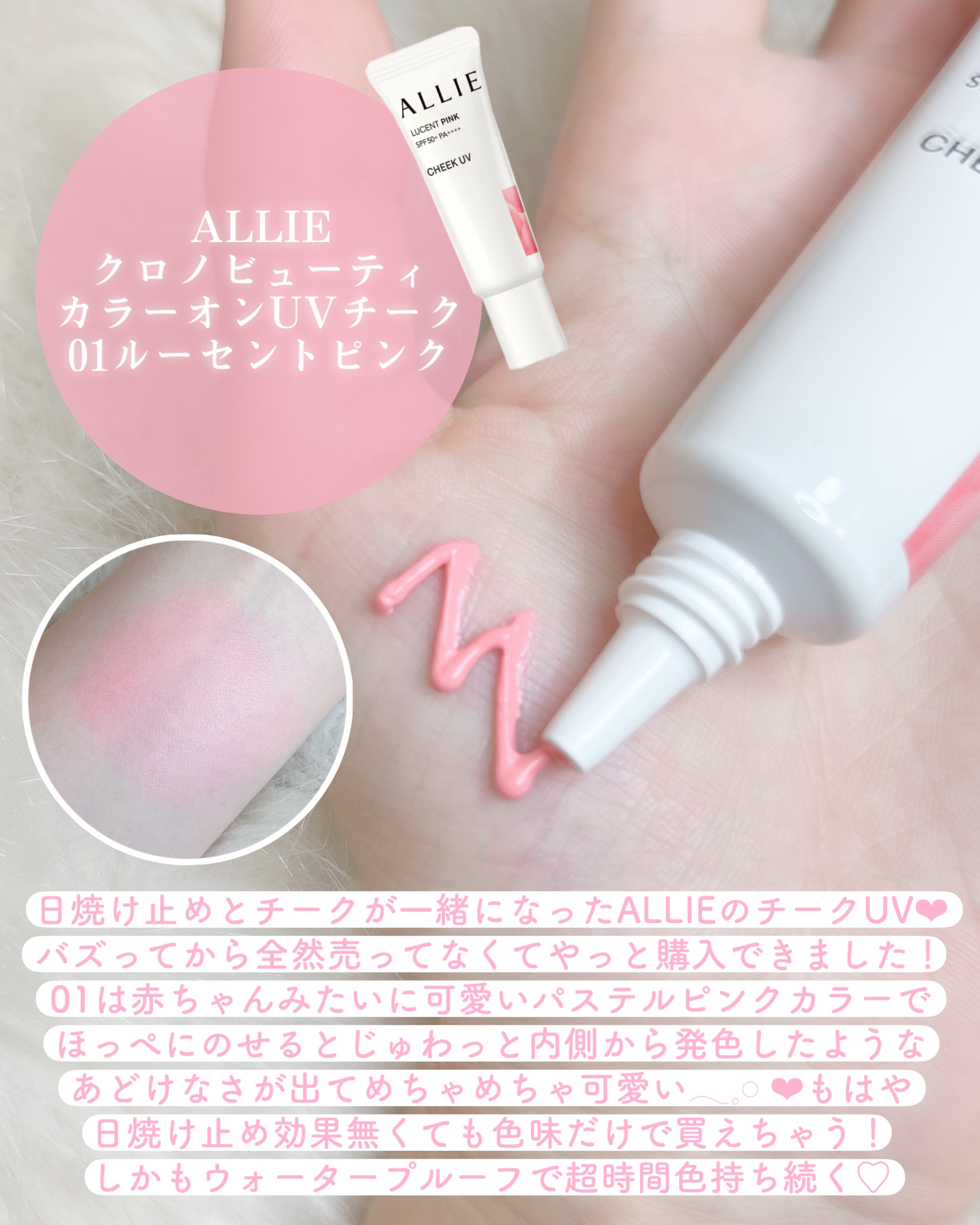 - ◆紫外線を浴びやすい、頬に使えるチークUV/鼻・頬に使える追いツヤUV ◆メイクの上から塗り直しとしても使える。 ◆汗・皮脂 マスクやタオルなどのこすれにも強く落ちにくい。 ◆「カラーUVヴェール技術」で、ベースメイクと混ざりにくく均一に密着。 SPF50+と感触の良さはそのままに素肌を活かした自然な色づきを両立! ◆8時間色持ち データ取得済み ※アリィー調べ。効果には個人差があります。 <基本情報> ・強力UV カット(SPF50+・PA++++) ・フリクションプルーフ:タオルやマスク等のこすれにも強く、落ちにくい ・スーパーウォータープルーフ:汗・水に抜群※²に強い機能 ※² アリィー商品内において LUCENT PINK(チーク 01) 自然に色づき血色感仕上がりの‟透け感ピンク” パッケージもピンクで、ポーチの中も華やぐメイクアイテムです WARM ORANGE(チーク 02) ヘルシーな血色感仕上げの‟じんわりオレンジ” じんわ~りと血色感を与えてくれるから、素肌を活かした自然な仕上がりに TRANSLUCENT(ラスター) ツヤ感を演出する‟シマーカラー” 鼻や頬にハイライトとして使うことで長時間ツヤが持続します