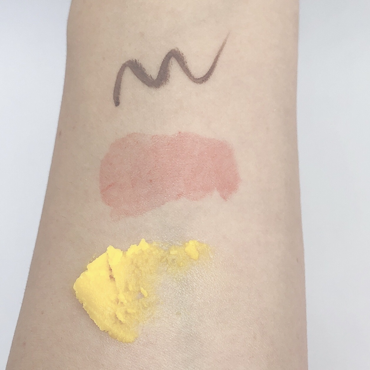 全体的には、名前のとおりヌーディーな印象☺️定番色「01 本命のブラウン」と似てるんだけど、今回の「104 本能のヌードベージュ」の方が、よりヌーディーなカラーとなっておりまする💁🏻♀️ 左上のベージュカラー(1番)は、基本的にはマットカラーなんだけど、ほんのりラメも入ってるから、のっぺりとした印象にならなくて良き🥰 4番のカラーは、ハイライトとして使うこともできるし、個人的には涙袋に使っても良いのではないかと思っておりまする👻 こちらは、全体的にしっとりとしたテクスチャーとなっておりまする💖そして、上2色のマットカラーが、結構しっかり発色してくれます❣️ 右下のハイライトカラーも、「104 本能のヌードベージュ」ほど白っぽくならないので、さりげなくハイライトを入れたい人にピッタリ✨
