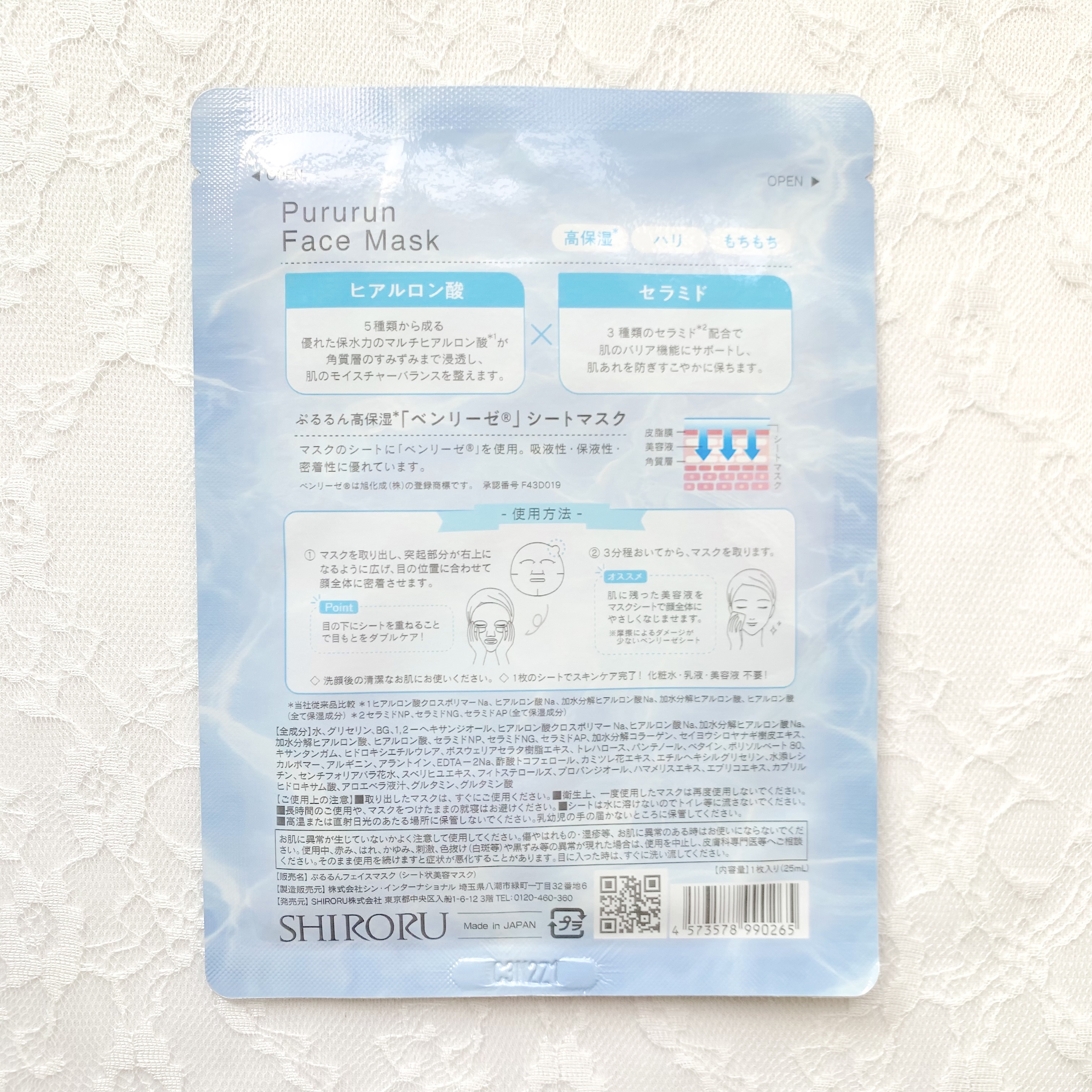 - ヒアルロン酸*、セラミド*美容液をたっぷり配合。保湿だけでなく、肌荒れ予防にも◎さらに、全ての顔の形にフィット!年齢が出やすい目元ギリギリまでケア出来るSHIRORUオリジナル型になっています。顔に直接付けるものだからSHIRORUは、シートの材質にもこだわり、高密着・保液性・吸液性にこだわった高級なベンリーゼを採用しています。1回3分の新習慣!潤ってぷるるんお肌になれるシートマスクになります。*保湿成分