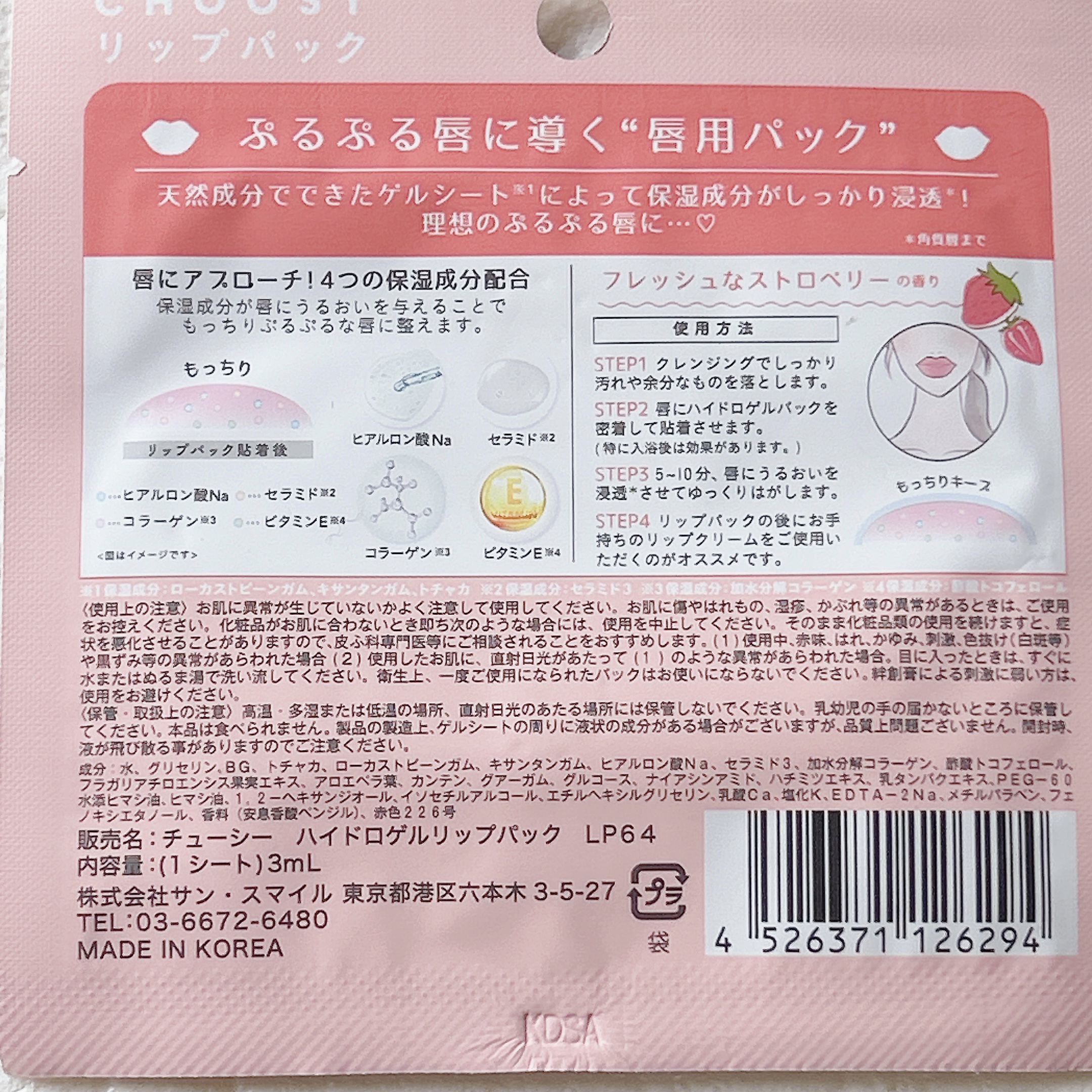 - 乾燥や皮むけなどが気になりがちな「くちびる」のために開発した、専用パック。密着性の高いハイドロゲルがくちびるに保湿成分をしっかり密封させ、角質層まで浸透。 SNSでもグローバルに注目されている、キュートで、しかも高機能な人気アイテム♪ ●血行が良くなっている入浴後のリップケアに ●特別な日のメイク前に ●皮膚のターンオーバー周期(約5~7日)に合わせた週1のリップケアに ●貼るだけ密着、プルプル保湿 ●気分や好みで選べる!5つの香り ・ピーチ ・ミルク ・ハニー ・フルーツ ・ハーブ <使用方法> 1. クレンジングで、くちびるに残ったメイクや汚れをしっかり落としてから、 くちびるにリップパックを密着させます。 2. 5~10分間、くちびるにうるおいを浸透させてから、ゆっくりとはがします。 ※ ひどい乾燥時にはミネラルウォーターをくちびるに塗って、表面を柔らかくしてから使用すると、保湿成分の浸透力アップ。