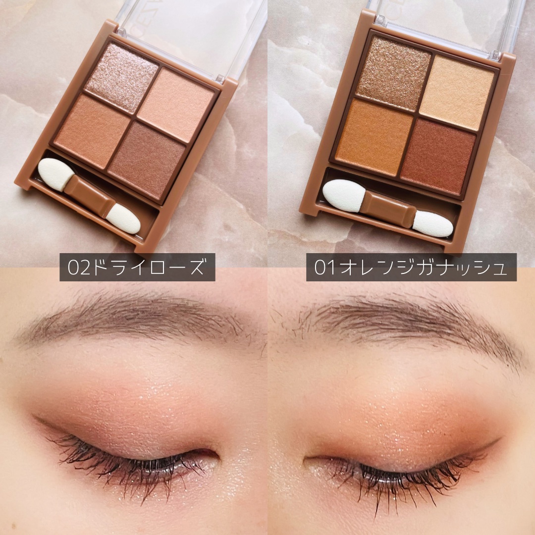 - 透け感マット×濃厚ブラウンの4色アイシャドウ。 しっかり目元を引き締めるビターなブラウンカラー。 透け感のあるブラウンを重ねて、自然な陰影のある目元へ。 ふんわり柔らかなパウダーなので、スルスル伸びてまぶたにピタッと密着。 保湿成分(スクワラン、ホホバ種子油)配合。
