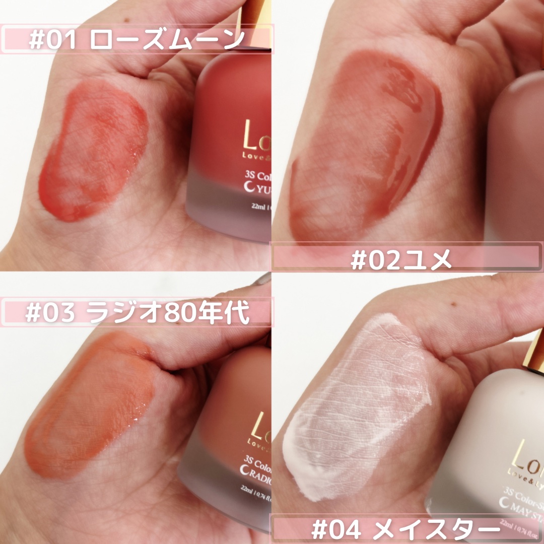 - <01 Rose Moon> 水、メチルトリメチコン、ジメチコン、エチルヘキサン酸セチル、イソノナン酸イソノニル、エタノール、ポリブテン、グリセリン、PEG-10ジメチコン、ペンチレングリコール、(ビニルジメチコン/メチコンシルセスキオキサン)クロスポリマー、1,2-ヘキサンジオール、加水分解フィブロイン、グリセリルグルコシド、ビスジグリセリルポリアシルアジペート-2、ジステアルジモニウムヘクトライト、硫酸Mg、マイカ(CI77019)、酸化チタン(CI77891)、酸化鉄(CI77491)、グンジョウ(CI77007)、赤226(CI73360)、酸化鉄(CI77492)、酸化鉄(CI77499)、BG、トリエトキシカプリリルシラン、オキシ水酸化Al、セチルPEG/PPG-10/1ジメチコン、クワ葉エキス、エチルヘキシルグリセリン、エチレンジアミンジコハク酸3Na <02 YU-ME> 水、メチルトリメチコン、ジメチコン、エチルヘキサン酸セチル、イソノナン酸イソノニル、エタノール、ポリブテン、グリセリン、PEG-10ジメチコン、ペンチレングリコール、(ビニルジメチコン/メチコンシルセスキオキサン)クロスポリマー、1,2-ヘキサンジオール、加水分解フィブロイン、グリセリルグルコシド、ビスジグリセリルポリアシルアジペート-2、ジステアルジモニウムヘクトライト、硫酸Mg、マイカ(CI77019)、赤226(CI73360)、酸化チタン(CI77891)、酸化鉄(CI77492)、酸化鉄(CI77491)、グンジョウ(CI77007)、酸化鉄(CI77499)、BG、トリエトキシカプリリルシラン、オキシ水酸化Al、セチルPEG/PPG-10/1ジメチコン、マグワ葉エキス、エチルヘキシルグリセリン、エチレンジアミンジコハク酸3Na <03 Radio 80’s > 水、メチルトリメチコン、ジメチコン、エチルヘキサン酸セチル、イソノナン酸イソノニル、エタノール、ポリブテン、グリセリルグルコシド、PEG-10ジメチコン、1,2-ヘキサンジオール、グリセリン、(ビニルジメチコン/メチコンシルセスキオキサン)クロスポリマー、ペンチレングリコール、BG、加水分解フィブロイン、ジステアルジモニウムヘクトライト、ビスジグリセリルポリアシルアジペート-2、硫酸Mg、酸化チタン(CI77891)、酸化鉄(CI77491)、酸化鉄(CI77499)、セチルPEG/PPG-10/1ジメチコン、クワ葉エキス、エチルヘキシルグリセリン、エチレンジアミンジコハク酸3Na <04 May Star> 水、メチルトリメチコン、ジメチコン、エチルヘキサン酸セチル、イソノナン酸イソノニル、エタノール、ポリブテン、グリセリルグルコシド、PEG-10ジメチコン、1,2-ヘキサンジオール、グリセリン、(ビニルジメチコン/メチコンシルセスキオキサン)クロスポリマー、ペンチレングリコール、BG、加水分解フィブロイン、ジステアルジモニウムヘクトライト、ビスジグリセリルポリアシルアジペート-2、硫酸Mg、酸化チタン(CI77891)、酸化鉄(CI77492)、酸化鉄(CI77491)、酸化鉄(CI77499)、セチルPEG/PPG-10/1ジメチコン、クワ葉エキス、エチルヘキシルグリセリン、エチレンジアミンジコハク酸3Na