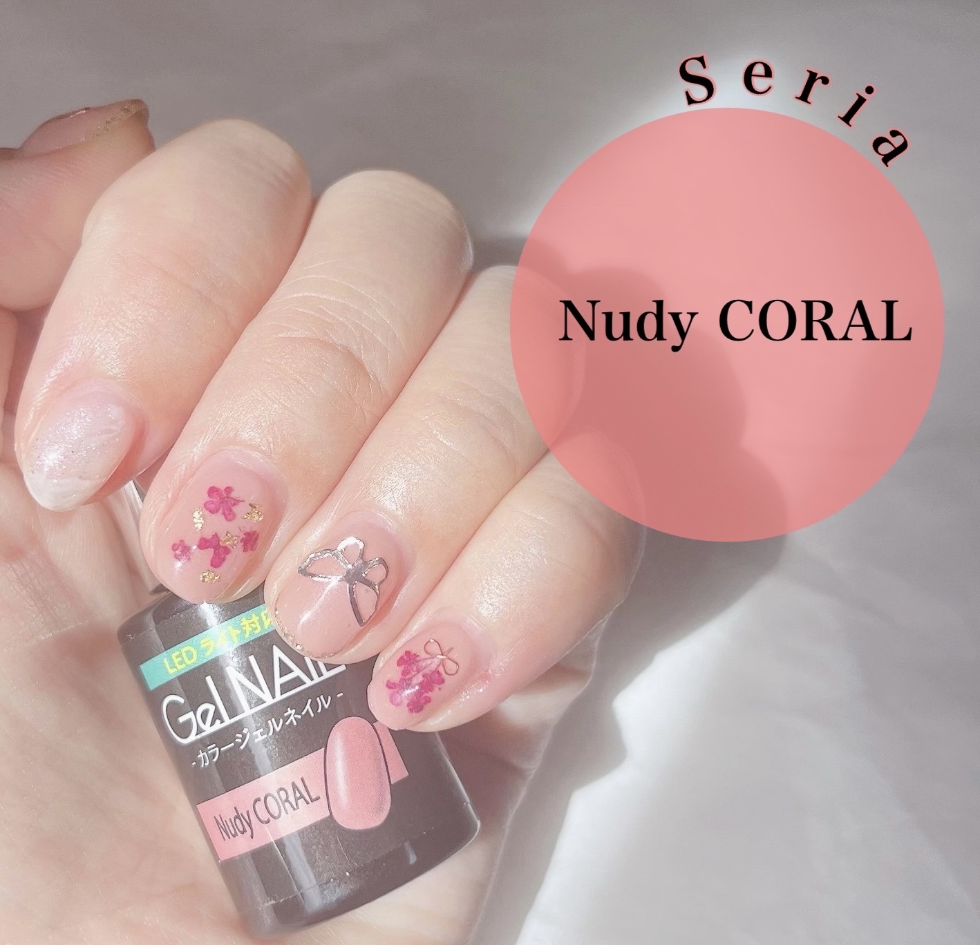 セリアのヌーディコーラルがめちゃくちゃおすすめだった..!! 透け感のあるナチュラルカラーで誰でも合いそう💗 オフィスネイルにも使えるから一度使ってみてほしい🥺 一度塗りだとうっすらピンクベージュでこのままでも可愛い! よりナチュラルが好きな人はこのままでも🫶🏻 二度塗りだとピンクが濃くなって可愛さが増す☺️💗 自爪が少し透ける感じ!ムラにもなりにくくて初心者さんにもおすすめ!ちゅるん感もあって絶妙に可愛い🧡