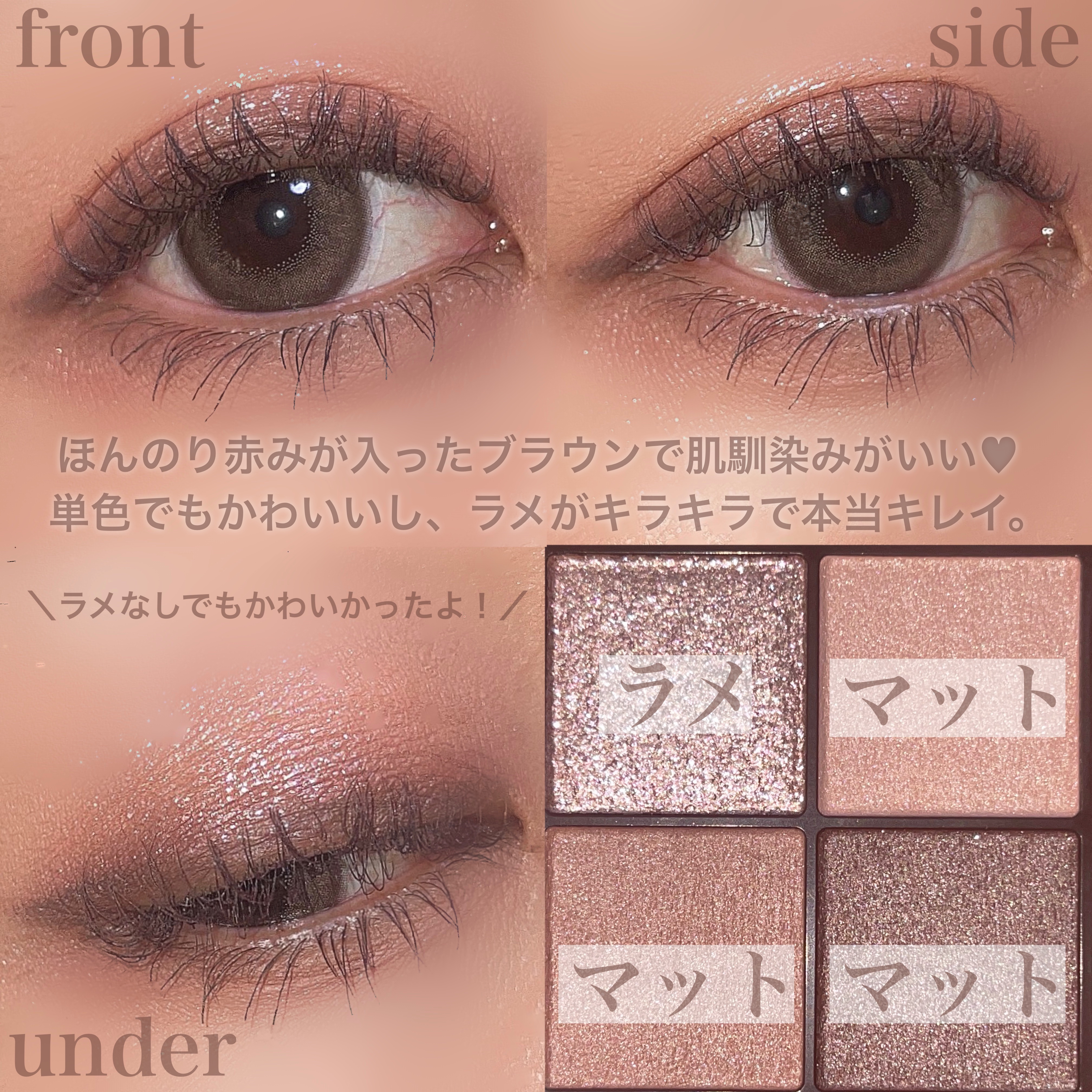 - 透け感マット×濃厚ブラウンの4色アイシャドウ。 しっかり目元を引き締めるビターなブラウンカラー。 透け感のあるブラウンを重ねて、自然な陰影のある目元へ。 ふんわり柔らかなパウダーなので、スルスル伸びてまぶたにピタッと密着。 保湿成分(スクワラン、ホホバ種子油)配合。