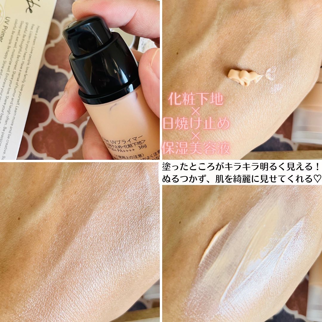 最近ノーファンデをはじめたお友達の肌がすごくキレイで。日焼け止めとか何使ってるのか聞いたらこれだよって教えてくれたので、さっそく私も使い始めました♡ &be(アンドビー)「UVプライマー」下地なんだけど、カバー力が高めでとにかくツヤがキレイ。肌にみずみずしい透明感を与える微細パールが高配合されてるんだそう。 SPF50+・PA++++と高い紫外線カット効果をノンケミカル処方で実現。鉱物油、紫外線吸収剤、石油系界面活性剤、タール系色素、合成香料不使用のフリー処方で、石鹸オフできるのも嬉しいポイント。