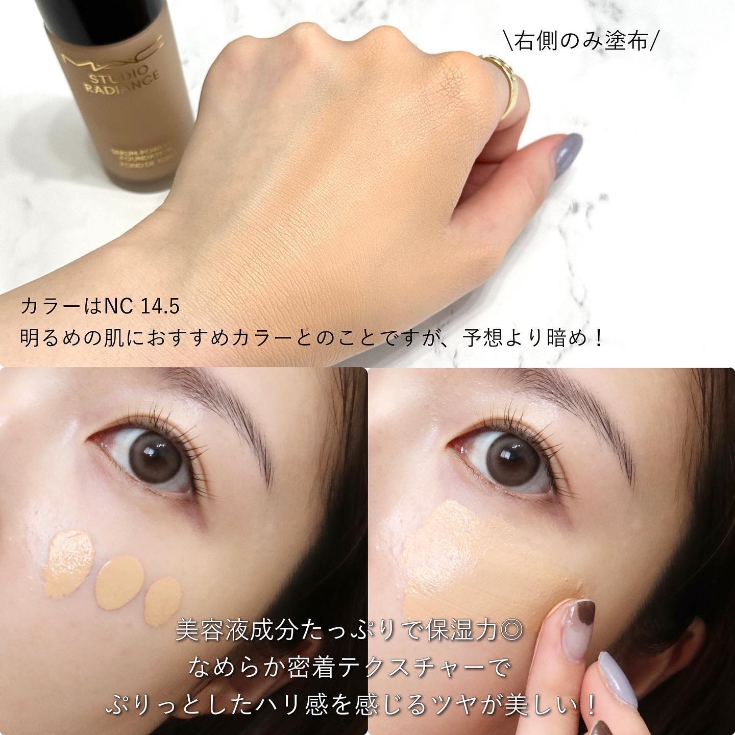 - ■素肌から発光するようなつや。80%美容液ベース。 M·A·Cアーティストが作り出すような、透明感ある仕上がり。つや肌12時間続く 肌の悩みをカバーするためのファンデーションから、美しい肌を魅せるためのファンデーションへ。 80%美容液ベース*1、 33種のスキンケア成分*1 配合のなめらかなテクスチャーで、肌に潤いと透明感をもたらすことで、まるで素肌から発光するような、透明感のあるつや肌へ仕上げます。 つけたての透明感ある仕上がり。フレッシュなツヤ感のある仕上がりが12時間*3続きます。 33種のスキンケア成分、主な成分: ヒアルロン酸Na(保湿成分)、ホホバ種子油 (保湿成分)、オリーブ油 (保湿成分)、ヒマワリ種子エキス (保湿成分)、オオムギ種子エキス (保湿成分)、キュウリ果実エキス (保湿成分) *1 美容液ベース及びスキンケア成分とは、着色剤、製品の防腐剤や安定剤を除く、水や保湿成分、皮膚コンディショニング成分のこと *2 化粧もち(色落ち)データ取得済み (当社調べ。効果には個人差があります)