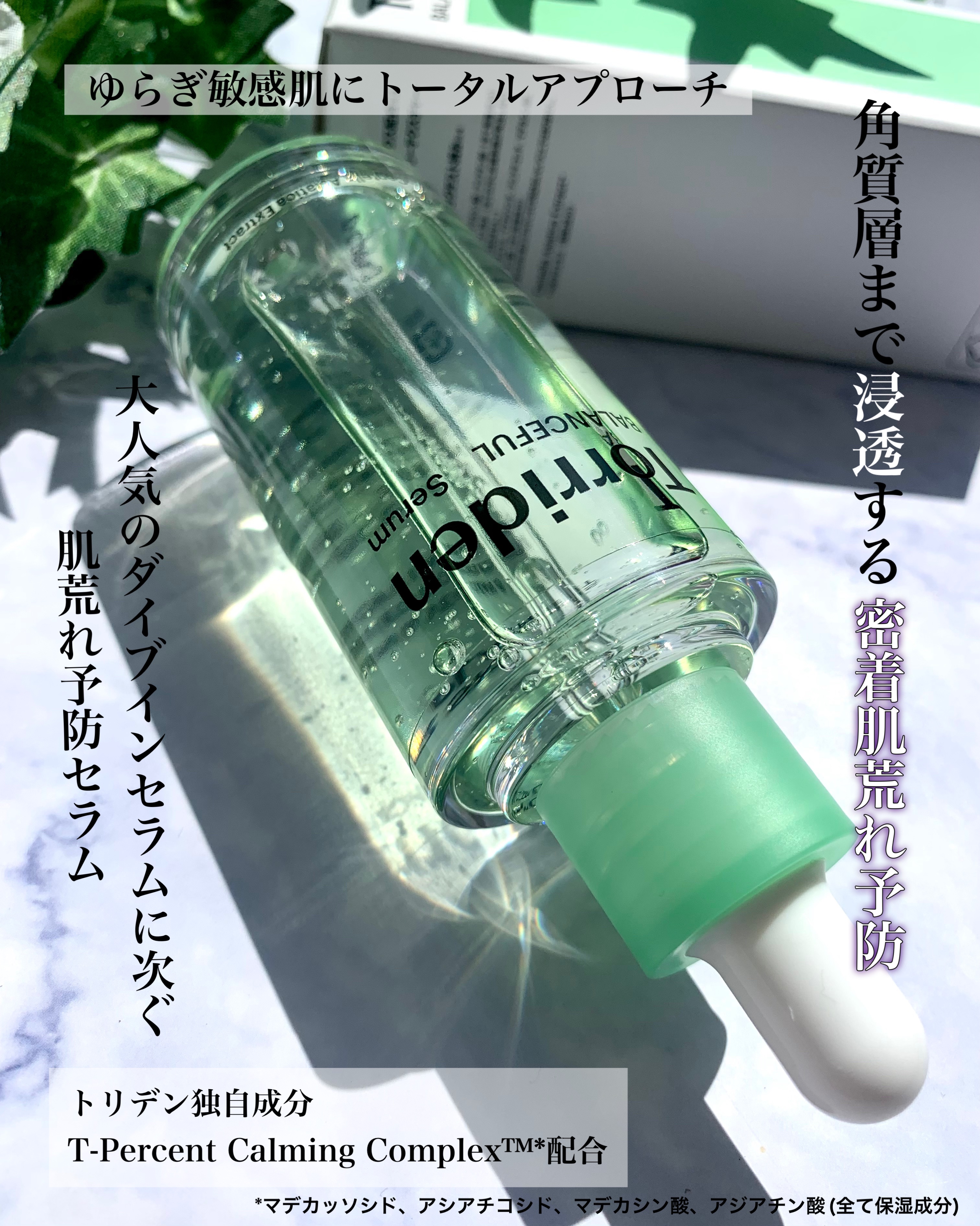 - トリデン独自のT-パーセントカーミングコンプレックス*1により集中整肌ケアできるセラム。敏感に傾かせてしまう過剰な皮脂や不要な角質も肌のことを考えた成分LHA*2でなめらかな肌へと導きます。 *1乳酸桿菌発酵液、ツボクサエキス、タチアオイ花エキス、ニンファエアコエルレア花エキス、センブリエキス、1,2-ヘキサンジオール(すべて整肌成分) *2カプリロイルサリチル酸(整肌成分)
