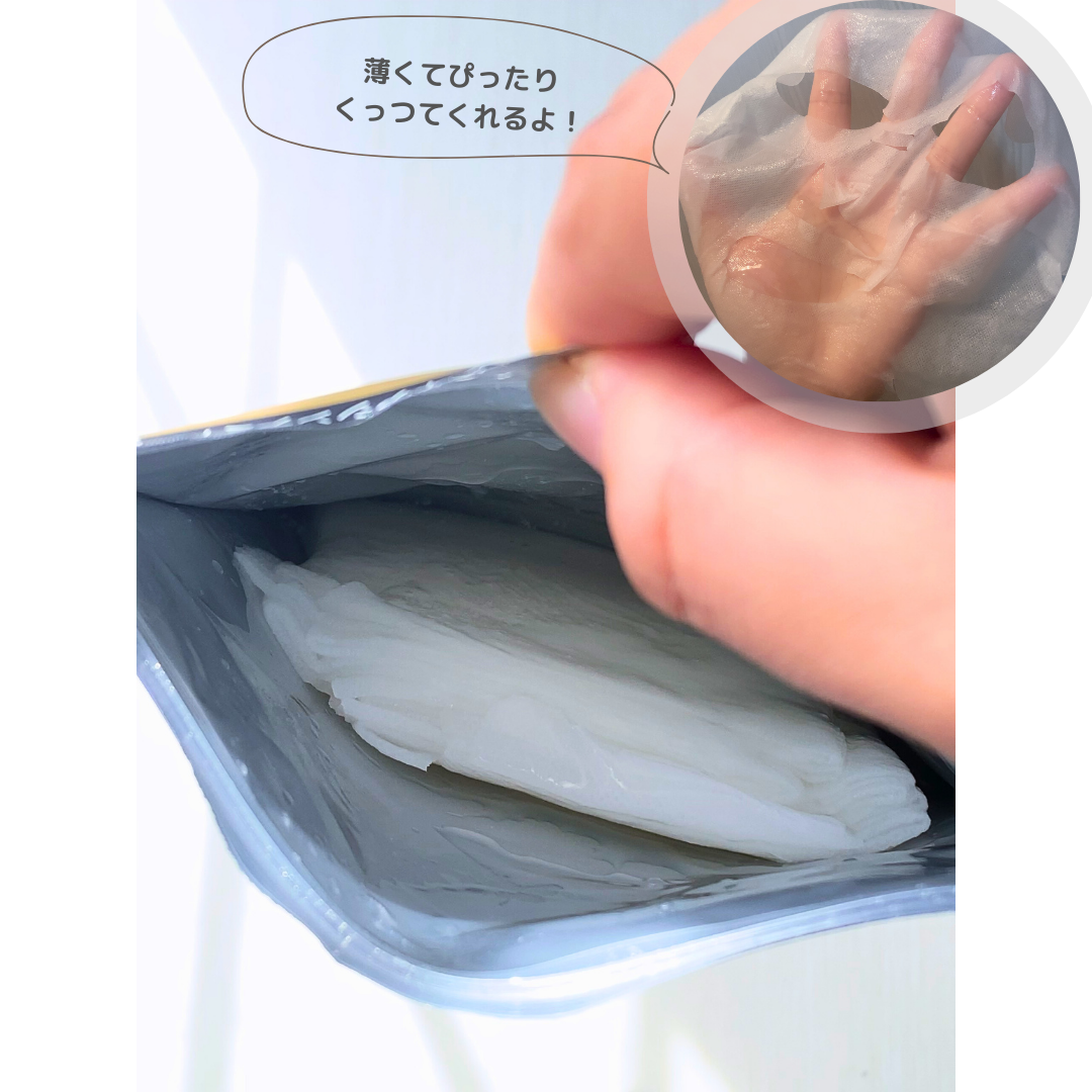 化粧水フェイスマスクとなっているところがポイントとなっていて 毎日の化粧水の代わりに使えるらしい! 大人のくすみの原因でもある糖化やメラニンの蓄積に着目した フェイスマスクで毎日の化粧水として置き換えることで うるおいが逃げにくい肌に保ち、健やかなツヤ感と透明感のある肌へと 導いてくれるそう。 そしてマスクシートですが肌触りがよくていい感じ。 あとシート自体が少し大きいからフェイスラインもすっぽりと覆ってあげられる感じがまたいい!