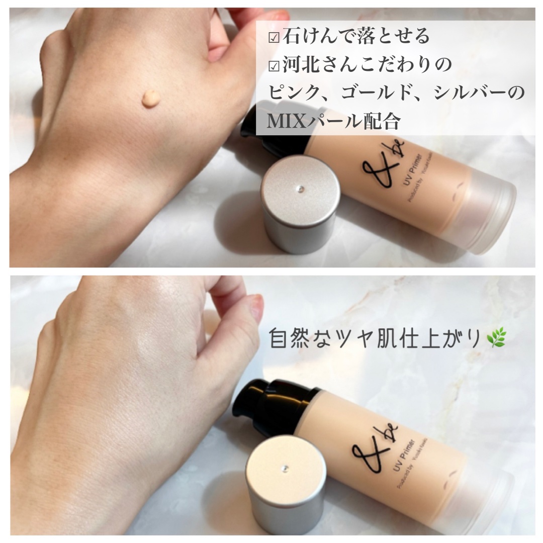 最近ノーファンデをはじめたお友達の肌がすごくキレイで。日焼け止めとか何使ってるのか聞いたらこれだよって教えてくれたので、さっそく私も使い始めました♡ &be(アンドビー)「UVプライマー」下地なんだけど、カバー力が高めでとにかくツヤがキレイ。肌にみずみずしい透明感を与える微細パールが高配合されてるんだそう。 SPF50+・PA++++と高い紫外線カット効果をノンケミカル処方で実現。鉱物油、紫外線吸収剤、石油系界面活性剤、タール系色素、合成香料不使用のフリー処方で、石鹸オフできるのも嬉しいポイント。