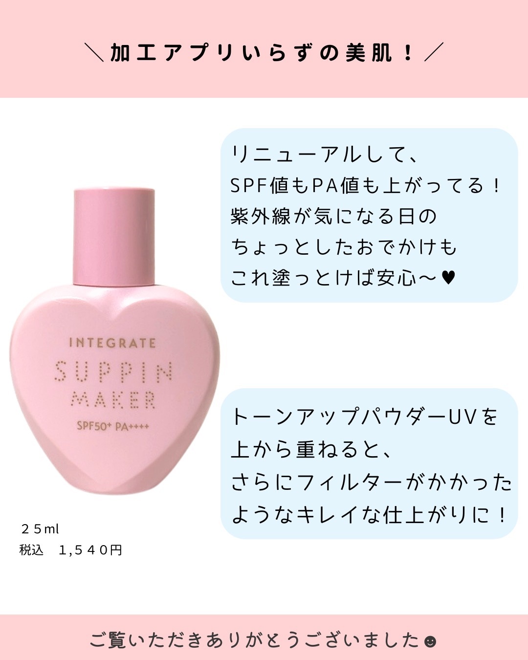 INTEGRATEすっぴんメイカートーンアップUVなめらかテクスチャーでのびもいいテカらずにつるんとした程よいツヤ感なのにベタつきなし😳自然なトーンアップ感だからノーファンデの日はこれだけで過ごしてますお粉をのせると更にキレイ見えするお肌に!...