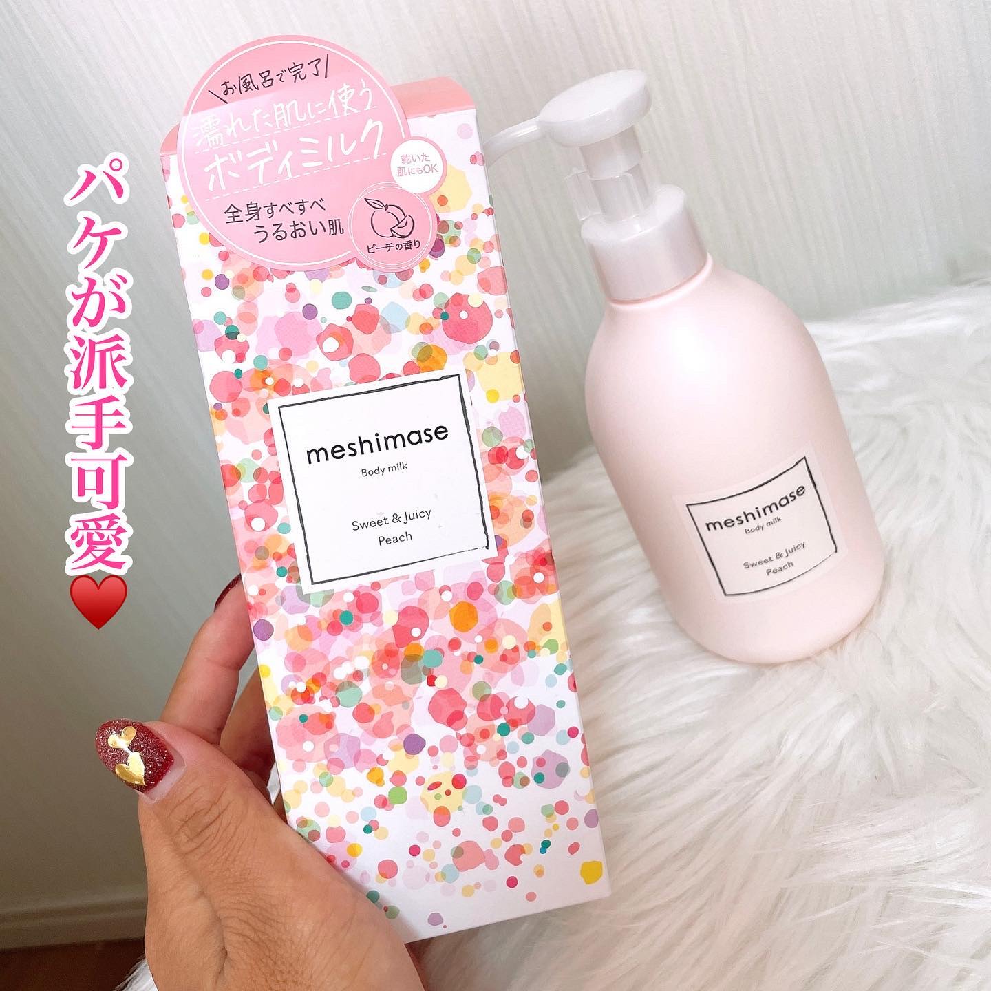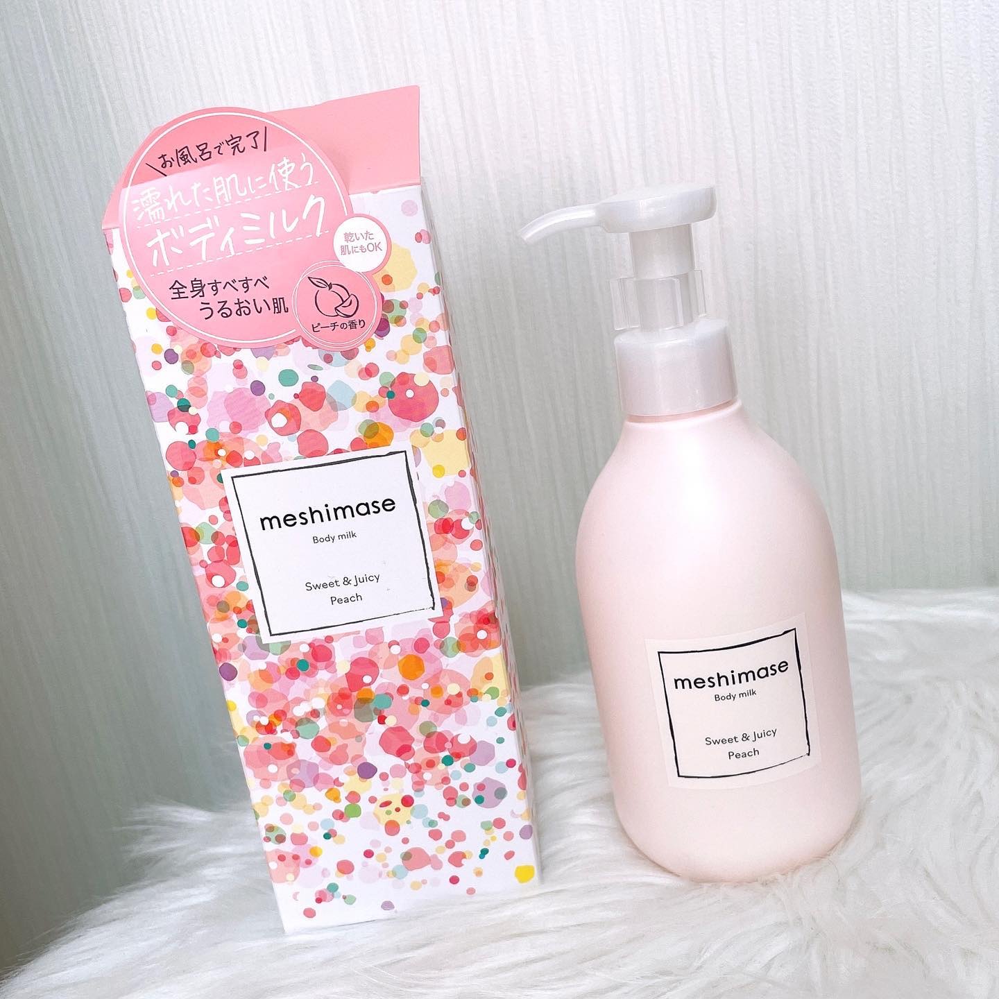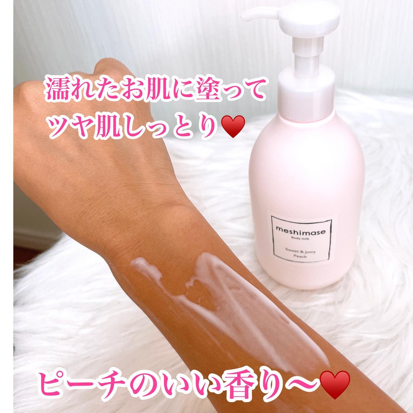 お風呂上がりの濡れたお肌に使えるボディ乳液🛁𓏸𓈒𓂃🤍保湿成分としてモモ果汁、スクワラン、マカデミア種子油、ヒアルロン酸Naを配合。 とろ~りミルクがするする伸びよく、べたつかずに、お肌にすーっとなじみしっとりと¨̮♡ ふんわり香るスイート&ジューシーなピーチの香りがほんのり甘くてお気に入り🍑🤍