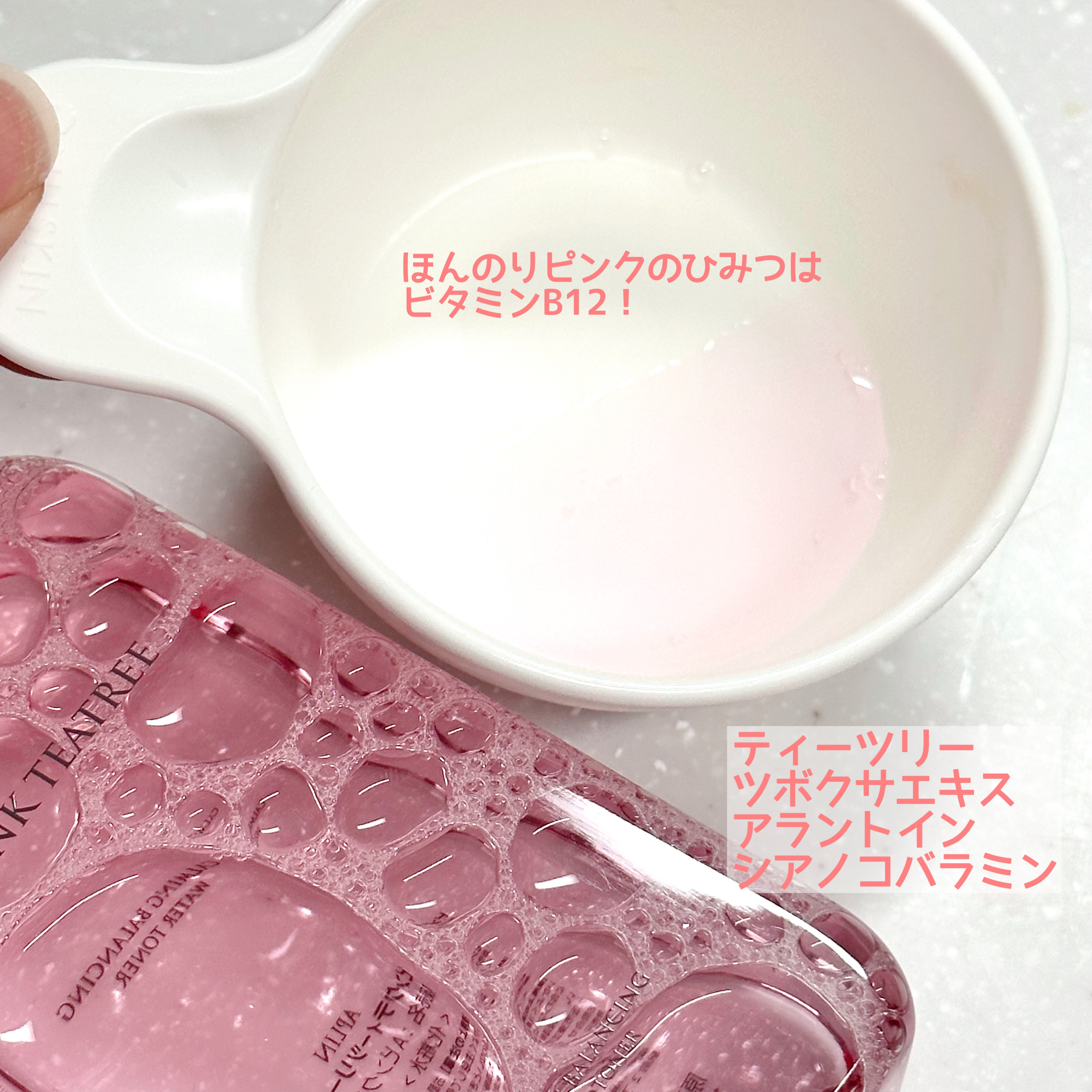 ティーツリーや、シカエキスを配合でニキビ、肌荒れ悩みをケアしてくれるトナー🩷 ピンク色は自然成分「ビタミンB12」本来の色だそう✨ サラサラテクスチャーで、さっぱりした使い心地✨