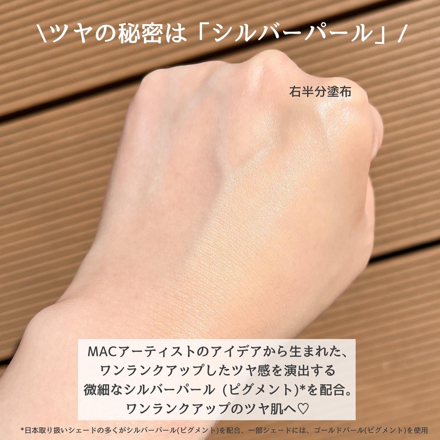 - ■素肌から発光するようなつや。80%美容液ベース。 M·A·Cアーティストが作り出すような、透明感ある仕上がり。つや肌12時間続く 肌の悩みをカバーするためのファンデーションから、美しい肌を魅せるためのファンデーションへ。 80%美容液ベース*1、 33種のスキンケア成分*1 配合のなめらかなテクスチャーで、肌に潤いと透明感をもたらすことで、まるで素肌から発光するような、透明感のあるつや肌へ仕上げます。 つけたての透明感ある仕上がり。フレッシュなツヤ感のある仕上がりが12時間*3続きます。 33種のスキンケア成分、主な成分: ヒアルロン酸Na(保湿成分)、ホホバ種子油 (保湿成分)、オリーブ油 (保湿成分)、ヒマワリ種子エキス (保湿成分)、オオムギ種子エキス (保湿成分)、キュウリ果実エキス (保湿成分) *1 美容液ベース及びスキンケア成分とは、着色剤、製品の防腐剤や安定剤を除く、水や保湿成分、皮膚コンディショニング成分のこと *2 化粧もち(色落ち)データ取得済み (当社調べ。効果には個人差があります)