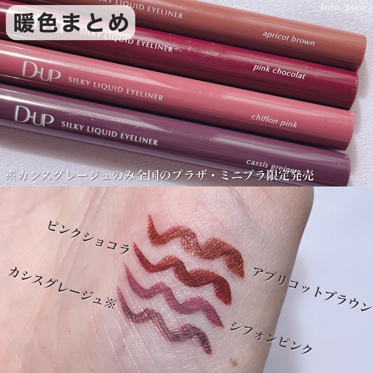 - 筆先までずっとなめらか、目尻で感動するリキッドアイライナー。 必要な量が肌にのる新設計で、まぶたの上をすべるような、滑らかな描き心地。しなやかでコシのある筆が、筆圧のコントロールを容易にし、太いラインも細いラインも思い通りに仕上げます。水、汗、涙に強いウォータープルーフタイプなのに、通常洗顔で簡単オフ。肌に色素が残らない顔料を使用。5種類の美容液成分を従来品の200%配合し、メイクしながら目元ケアまで。 ●ブラウンブラック ※2020年9月12日 バラエティショップ先行発売 ●漆黒ブラック ※2020年12月頃発売予定 ●ナチュラルブラウン ※2020年12月頃発売予定 ●シフォンブラウン 「毎日メイクに透明感と抜け感」 ブラウンでも、グレーでも、ベージュでもないニュアンスカラー。 自然な印影で素の目元を際立て、頑張りすぎない、ふんわりとした目元に。 ●アプリコットブラウン 「じゅわっと血色感。 肌に馴染むおしゃれカラー」 温かみのあるアプリコットがじゅわっと滲む血色感を目元に演出。 肌馴染みが良いので、カラーライナーに抵抗がある方もブラウンの延長線上で楽しめる、使いやすい色味です。 ”ちょっとオシャレ”な空気感を演出するカラー。 ●ピンクショコラ アイライナー 「ピンクが溶け込む濃厚ブラウン」 肌馴染みが良く、目元にじんわり血色感をプラス。 さりげなく女性らしさが加速するようなカラー。 ●ピスタチオラテ (2022年7月29日(金)発売) 「“目尻”に抜け感アクセント」 肌に馴染むのに映える絶妙なグリーン。 トレンドカラーに“くすみ”と“抜け感”をプラスしたまろやかな発色。 ●マスタードブラウン 「“イエロー”が揺れる、大人の洒落色」 (2022年7月29日(金)発売) まるで太陽のような暖かさを感じる新しいブラウン。 ほんのり感じるイエローでメイクが一気に垢抜ける稀有な色。 ●シフォンピンク(2023年2月10日発売) 「ふんわり柔らか"まろみピンク"」 甘くなりすぎない青みニュアンスで目元の透明感UP。 目元を引き締め、ピンクメイクにありがちな腫れぼったさを解消。 ●ミルクカプチーノ(2023年4月21日発売) まろやかな深みの“優しい締め色” どんなメイクにも合わせやすいカラー。 自然な陰影でさりげなく目幅を拡張します。 ●グレーカシミア(2023年10月1日発売) ブラウンがほんのり溶け込んだ、暖色グレー まろやかな発色で、パーソナルカラーを問わず肌に馴染む 目元の陰影になりすまし、抜け感と目力を欲張りに叶える ●ダークフィグ(2024年6月1日発売) するする”なめらか。描きやすいのに、落ちにくい。 クッキリ可愛いほの甘ダークブラウン ●ピーチモカ(2024年8月1日発売) ふわっと自然に盛れる“桃色ブラウン” ほんのり血色感で目元にうるみ感を演出 ●スターダストブラウン(2024年12月11日発売) キラッと繊細に輝く''星屑ブラウン'' 透け感のあるダークブラウンの色味とラメの輝きが、目元に艶のある立体感を演出 ●チャコールモカ(2025年4月10日発売) 目元を締める''深みグレージュ'' 黄みや赤みに偏りすぎない絶妙な色設計で、自然に目元を強調
