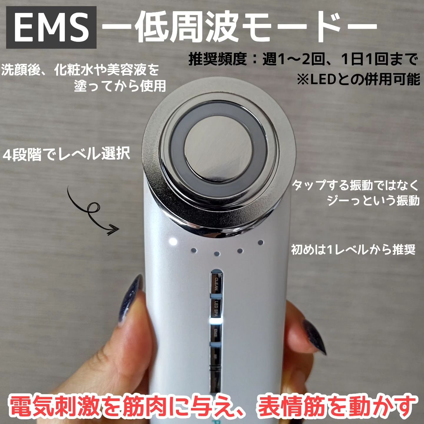 肌が敏感なので、4段階の強度レベルは1番弱いモードが私には丁度良かったです。 LEDSPAモードを使用するとヘッド部分が熱くなりやすいので、要注意です! SONIC PEELINGモードを使用すると鼻の毛穴に入ったファンデが完全にではありませんが、いつものクレンジングのときよりも落ちやすいので、お気に入りです🥰 充電式で気軽に使えて便利なので、今回頂けてとても嬉しかったです♪