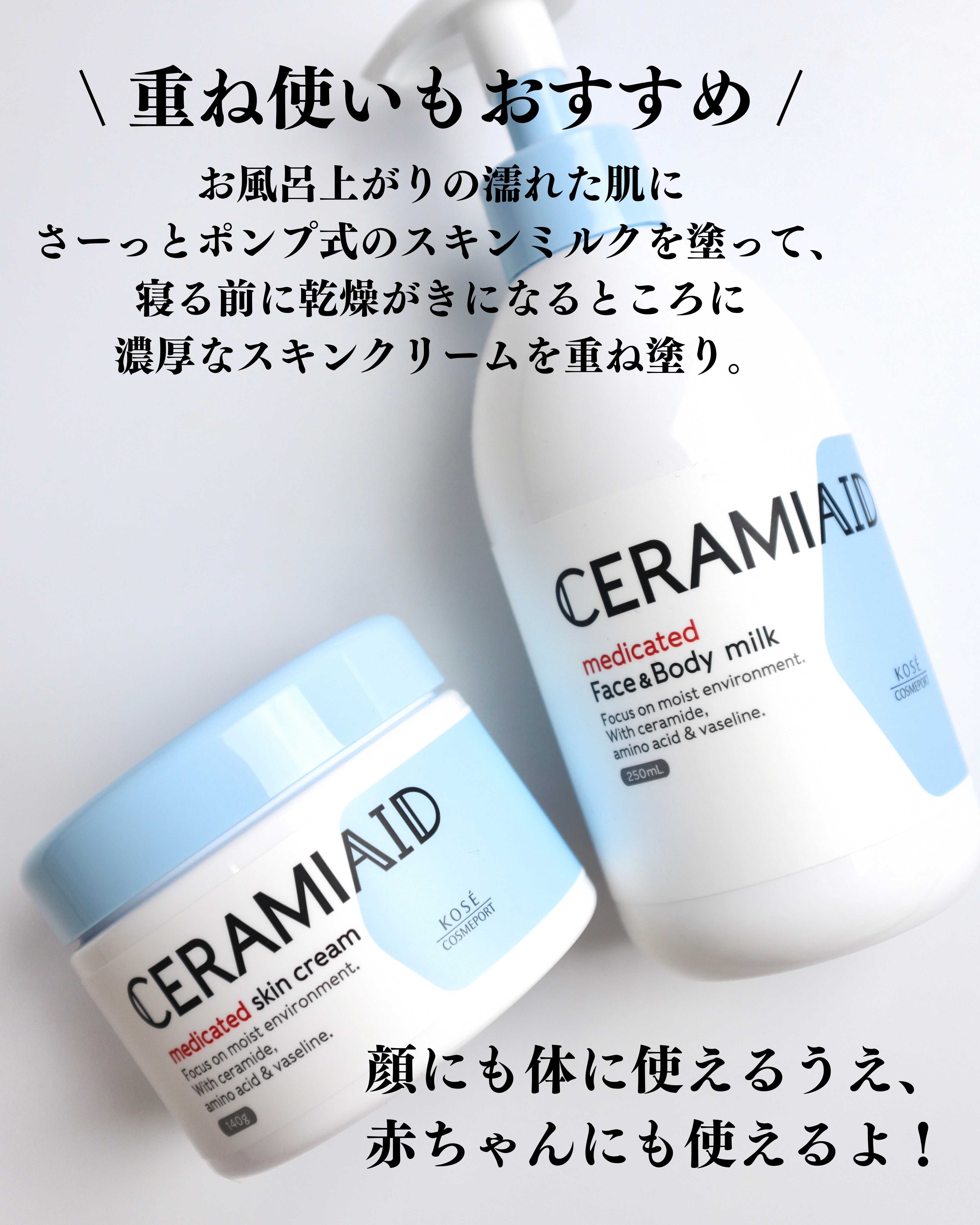 敏感肌・赤ちゃんにも使えるヒト型セラミド配合の無添加・薬用スキンケアシリーズ、Ceramiaid(セラミエイド)。 柔らかめのローションミルク系のテクスチャーで、するんと伸びて肌馴染みがGood🏅 無添加の医薬部外品だから赤ちゃんや敏感肌でも使えるぐらい優しい使い心地の薬用全身保湿ミルクです👶🏻