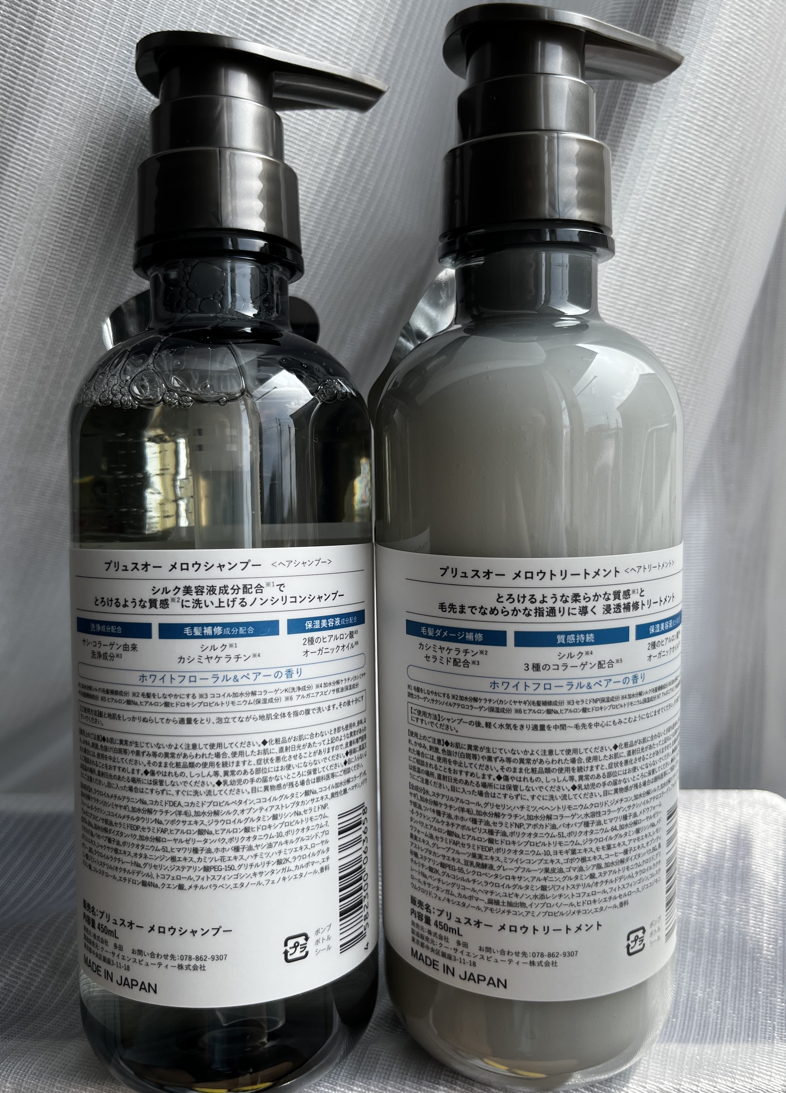 - <シャンプー 450ml> 水、ラウロイルメチルアラニンNa、コカミドDEA、コカミドプロピルベタイン、ココイルグルタミン酸Na、ココイル加水分解コラーゲンK、加水分解ケラチン(カシミヤヤギ)、加水分解ケラチン(羊毛)、加水分解シルク、オプンティアストレプタカンサエキス、異性化糖、ヘマチン、メドウフォーム-δ-ラクトン、ココイルメチルタウリンNa、ツボクサエキス、ジラウロイルグルタミン酸リシンNa、セラミドNP、アルガニアスピノサ核油、セラミドEOP、セラミドAP、ヒアルロン酸Na、ヒアルロン酸ヒドロキシプロピルトリモニウム、EDTA-2Na、加水分解ダイズタンパク、加水分解ローヤルゼリータンパク、ポリクオタニウム-10、ポリクオタニウム-7、アボカド油、バオバブ種子油、ポリクオタニウム-51、ヒマワリ種子油、ホホバ種子油、ヤシ油アルキルグルコシド、プロポリスエキス、シャクヤク根エキス、オタネニンジン根エキス、カミツレ花エキス、ハチミツ、ハチミツエキス、ローヤルゼリー、BG、ラウロイルラクチレートNa、グリセリン、ジステアリン酸PEG-150、グリチルリチン酸2K、ラウロイルグルタミン酸ジ(フィトステリル/オクチルドデシル)、トコフェロール、フィトスフィンゴシン、キサンタンガム、カルボマー、エチドロン酸、コレステロール、エチドロン酸4Na、クエン酸、メチルパラベン、エタノール、フェノキシエタノール、香料 <トリートメント 450ml> 水、ステアリルアルコール、グリセリン、ハチミツ、ベヘントリモニウムクロリド、ジメチコン、加水分解ケラチン(カシミヤヤギ)、加水分解シルク、加水分解コラーゲン、水溶性コラーゲン、サクシノイルアテロコラーゲン、加水分解ケラチン(羊毛)、加水分解ケラチン、アルガニアスピノサ核油、ツバキ種子油、ホホバ種子油、セラミドNP、アボカド油、バオバブ種子油、ヒマワリ種子油、メドウフォーム-δ-ラクトン、プルケネチアボルビリス種子油、ポリクオタニウム-51、ポリクオタニウム-64、加水分解ローヤルゼリータンパク、ヒアルロン酸Na、ヒアルロン酸ヒドロキシプロピルトリモニウム、ジラウロイルグルタミン酸リシンNa、メドウフォーム油、セラミドAP、セラミドEOP、ポリクオタニウム-10、ヨモギ葉エキス、モモ葉エキス、アマモエキス、レモン果実エキス、グレープフルーツ果実エキス、ミツイシコンプエキス、ゴボウ根エキス、コーヒー種子エキス、アプンティアストレプタカンサエキス、豆乳発酵液、グレープフルーツ果皮油、ゴマ油、シア脂、加水分解ダイズタンパク、BG、黒砂糖、ステアリン酸PEG-55、シクロベンタシロキサン、アルギニン、グルタミン酸、ステアルトリモニウムクロリド、グリチルリチン酸2K、グルコシルルチン、ラウロイウグルタミン酸ジ(フィトステリル/オクチルドデシル)、ラウロイルラクチレートNa、ベンチレングリコール、ヘマチン、ユビキノン、水添レシチン、トコフェロール、フィトスフィンゴシン、コレステロール、キサンタンガム、カルポマー、腐植土抽出物、イソプロパノール、ヒドロキシエチルセルロース、ジココジモニウムクロリド、フェノキシエタノール、アモジメチコン、アミノプロピルジメチコン、エタノール、香料 <シャンプー詰替用 350ml> 水、ラウロイルメチルアラニンNa、コカミドDEA、コカミドプロピルベタイン、ココイルグルタミン酸Na、加水分解ケラチン(カシミヤヤギ)、加水分解ケラチン(羊毛)、加水分解シルク、ココイル加水分解コラーゲンK、オプンティアストレプタカンサエキス、異性化糖、ヘマチン、メドウフォーム-δ-ラクトン、ココイルメチルタウリンNa、ツボクサエキス、ジラウロイルグルタミン酸リシンNa、セラミドNP、アルガニアスピノサ核油、セラミドEOP、セラミドAP、ヒアルロン酸Na、ヒアルロン酸ヒドロキシプロピルトリモニウム、EDTA-2Na、加水分解ダイズタンパク、加水分解ローヤルゼリータンパク、ポリクオタニウム-10、ポリクオタニウム-7、アボカド油、バオバブ種子油、ポリクオタニウム-51、ヒマワリ種子油、ホホバ種子油、ヤシ油アルキルグルコシド、プロポリスエキス、シャクヤク根エキス、オタネニンジン根エキス、カミツレ花エキス、ハチミツ、ハチミツエキス、ローヤルゼリー、BG、ラウロイウラクチレートNa、グリセリン、ジステアリン酸PEG-150、グリチルリチン酸2K、ラウロイルグルタミン酸ジ(フィトステリル/オクチルドデシル)、トコフェロール、フィトスフィンゴシン、キサンタンガム、カルポマー、エチドロン酸、コレステロール、エチドロン酸4Na、クエン酸、メチルパラベン、エタノール、フェノキシエタノール、香料 <トリートメント詰替用 350ml> 水、ステアリルアルコール、グリセリン、ハチミツ、ベヘントリモニウムクロリド、ジメチコン、加水分解シルク、加水分解ケラチン(カシミヤヤギ)、加水分解ケラチン(羊毛)、加水分解ケラチン、加水分解コラーゲン、水溶性コラーゲン、サクシノイルアテロコラーゲン、アルガニアスピノ