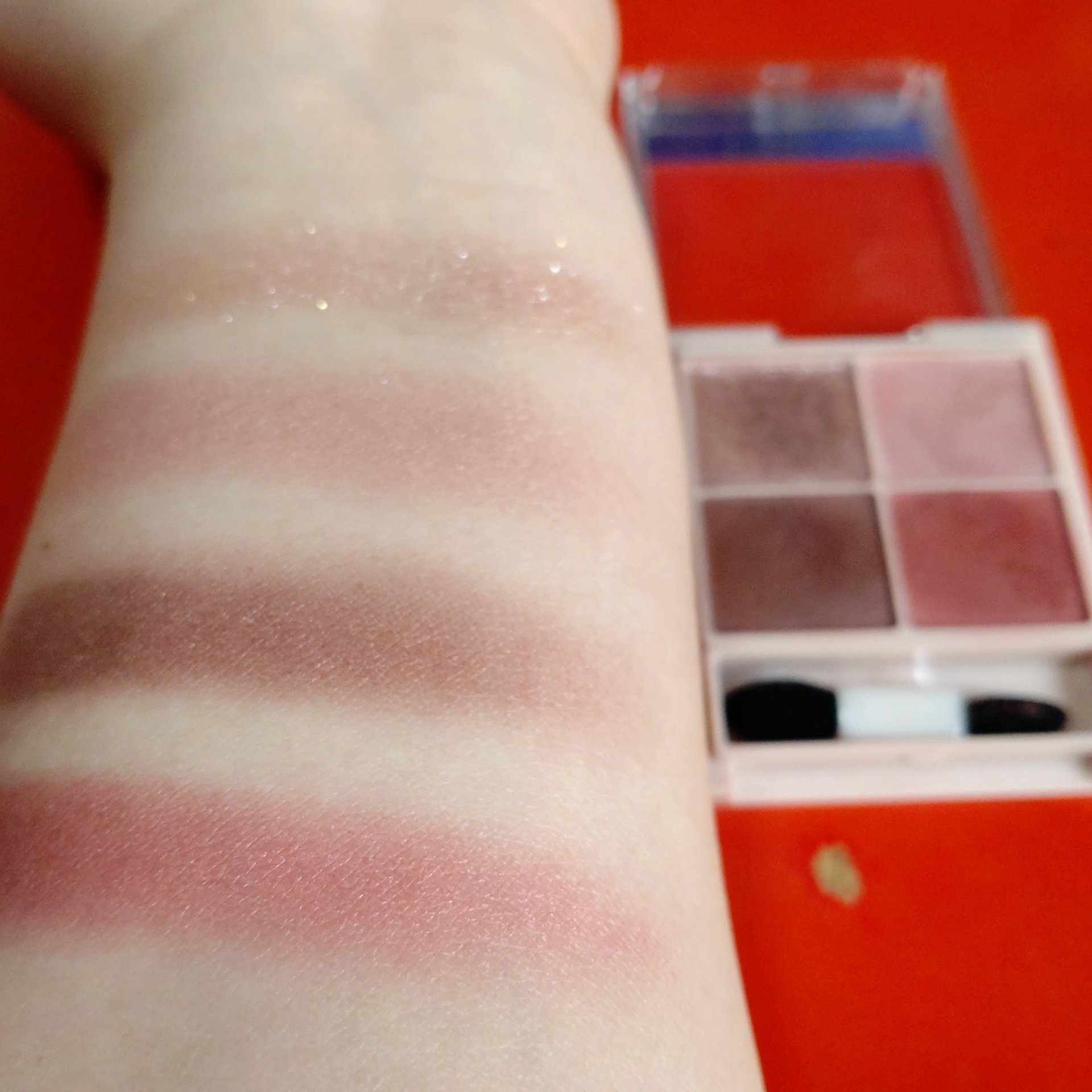プチプラのクオリティじゃないっ!! 発売前からチェックしていたけれど、ここまで可愛いとは…😆 絶妙カラーで目もとのくすみを飛ばして*明るい印象に🩷 横割りグラデーションでメイクし、立体感をより出したかったので最後に1番左のカラーを上まぶたの真ん中と涙袋にのせています🙆 肌馴染みも良くて粉飛びも感じにくかったです💕 ブラウンの方も店頭に出てたら買おうかな💓
