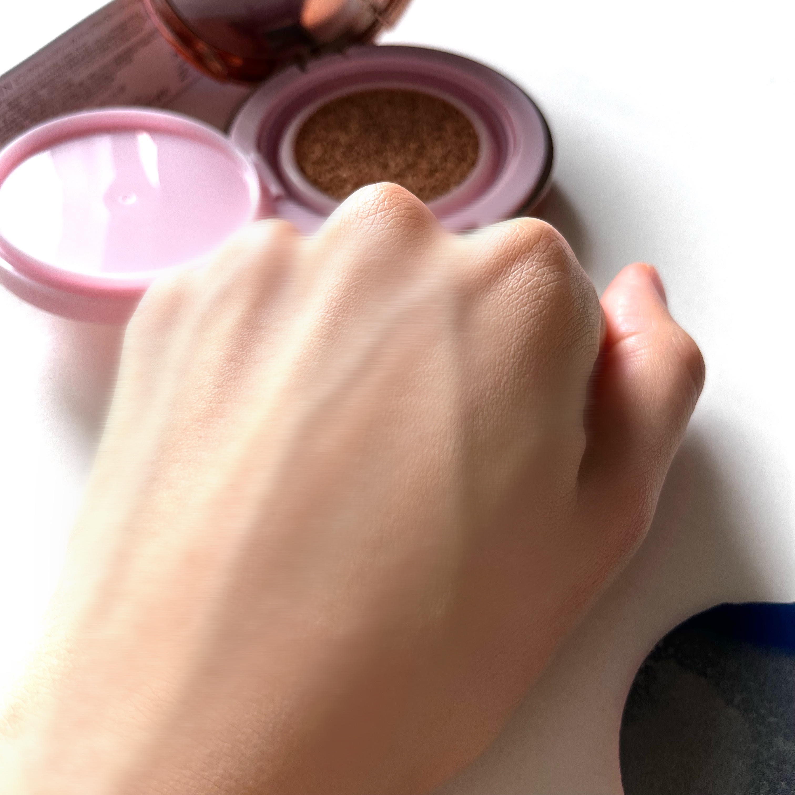 混合肌や敏感肌におすすめのピンクティーツリーカバープライマークッション カラーは『21号』を使用しました! SPF50+ PA++++の高UVカットのクッションファンデーション うるおい感がありながら、ピタッと肌に密着してくれるテクスチャ