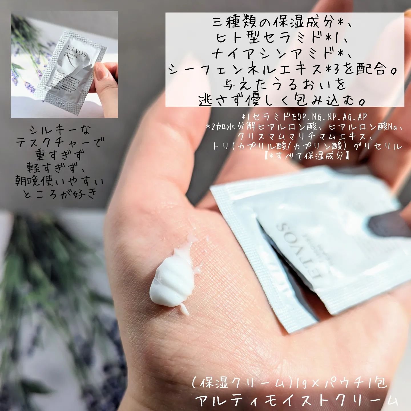 - エトヴォス独自の保湿サイエンスを搭載した大人の敏感肌を支える「アルティモイストライン」。 初めて試したい方や、旅行やジムのお供にもおすすめのキット。 大人の敏感肌を支える「アルティモイストライン」は、肌に本当に必要な成分を厳選し、 バランスよく贅沢に配合。 エトヴォス独自の保湿サイエンスに基づいたキー成分セラミディアル®コンプレックス*1で叶える、モイストフルネス™発想の新保湿スキンケアシリーズ。 天然ラベンダーの穏やかで落ち着いた香りを全品に採用し、肌も心も心地よく包み込み、リラックス感を演出するひと時を。 まずはじっくり10日間*2、「アルティモイストライン」を体感。 敏感肌でも保湿と心地よさの両立を諦めない。 思わず触れたくなるような、うるおい溢れるやわらかツヤ肌へとサポート。 *1 保湿成分:ヒト型セラミド(セラミドAG、AP、EOP、NG、NP)、ナイアシンアミド *2 アルティモイストクリームは1回分です 【内容】 クリアソープバー5g アルティモイストローション20ml アルティモイストセラム10ml アルティモイストクリーム1gパウチ×1包