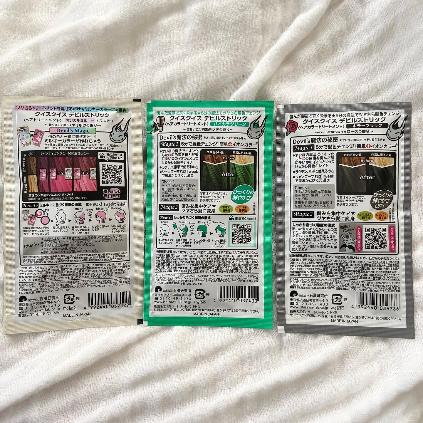 - 傷んだ髪ほどよく染まるヘアカラートリートメントで、“常色"はずれの映え発色! 素手で簡単5分、イオンカラーでツヤさら髪色チェンジ! 約1週間でもとの髪色に戻るから、流行カラーも気軽に試せます。 カラー剤とは思えないフルーツなどの香りで、カラーリング中も楽しめます♪ ※仕上がりの色は元の髪色・傷み具合・髪質によって個人差があります。 ※健康毛や暗い髪・白髪には発色しないことがあります。 <Devil’s 魔法の秘密> ①5分で髪色チェンジ!簡単+イオンカラー® イオン化した+の色素を傷んだ髪に多い-のイオンとくっつけるから発色キレイ♪ 素手でOK! シャンプーすれば1weekで魔法がとけて元通り! ②傷みを集中ケア★ツヤさら髪に変身 保湿成分「ホホバ種子油」「ツバキ種子油」配合で髪にたっぷり潤い満タン。驚きのツヤ髪に! ※頭皮につけないようにご注意ください。 ※素手で塗布したあとはすぐに石けんで手を洗ってください。