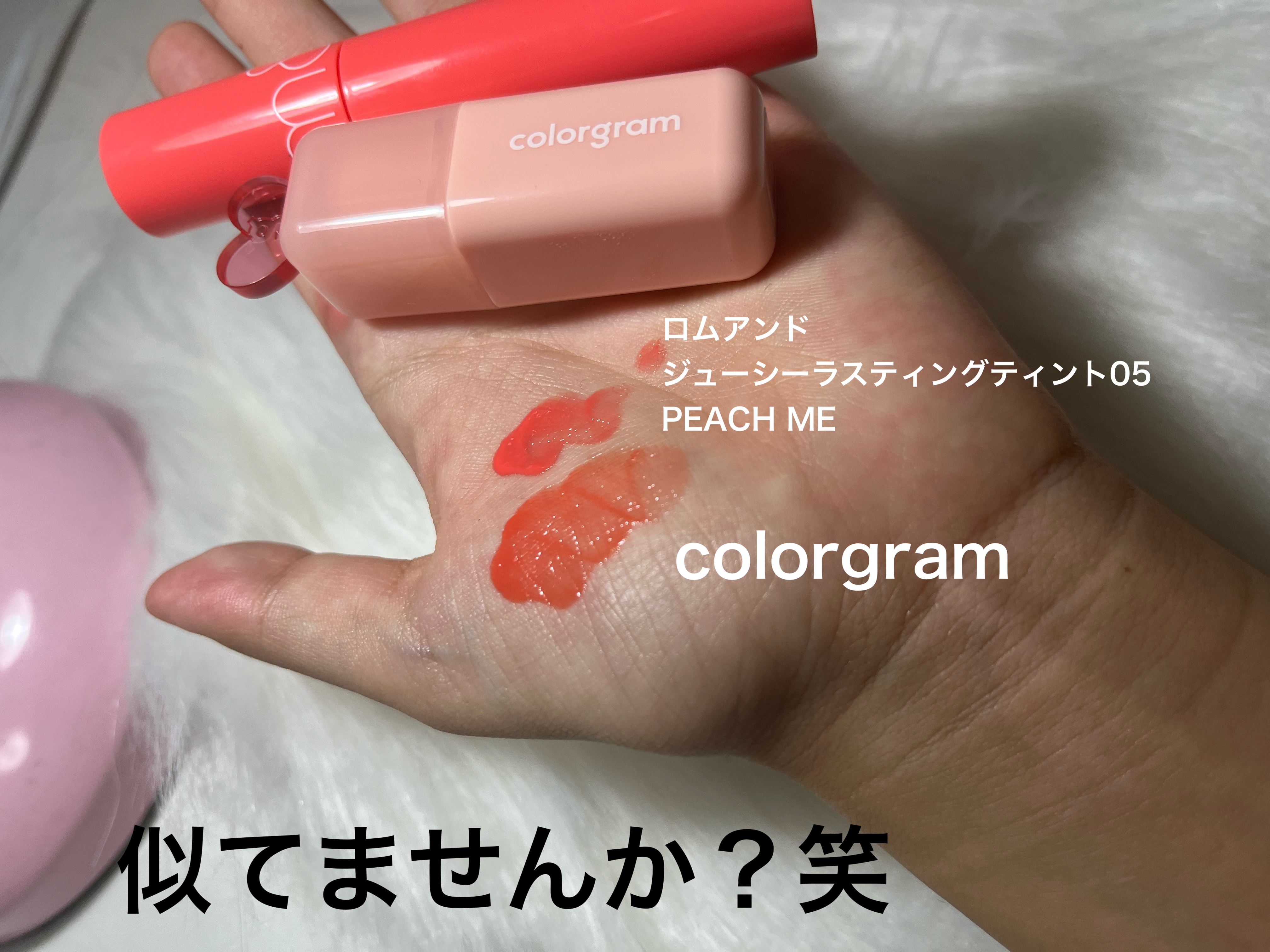 とても可愛いコーラルピンクのお色でとても可愛い!! このお色!廃盤になってしまったromandのジューシーラスティングティントの05、ピーチミーにそっくりなんです!!! そこで、今回は比較検証してみました♩