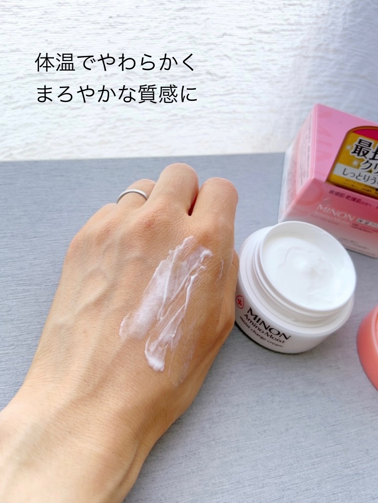 ミノン アミノモイストは敏感肌向けシリーズ。乾燥肌、混合肌、エイジングケアと3つのラインがあります。 全ライン共通で、9種の保潤アミノ酸配合・バリン・トレオニン・セリン・ロイシン・プロリン・ヒスチジン・グリシン・アラニン・アルギニン こっくりではなく軽めの質感のクリームで、馴染ませるとしっとり🫧