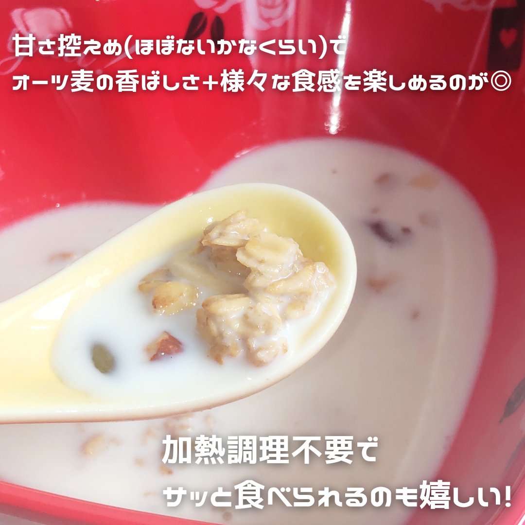オートミールをカルビー独自のベイクド製法でおいしく焼き上げた、甘くない(※フルグラ比)素材そのままのおいしさをいかしたシリアル(オートミール加工品)です。食物繊維・鉄分たっぷり✨ サクサクのベイクドオーツに、ナッツやシードがトッピングされているので香ばしさとカリっと食感があって美味しい💓 甘さはあまり感じられないので無糖のヨーグルトにかけて食べる時は、はちみつ、きなこをトッピングしています👍