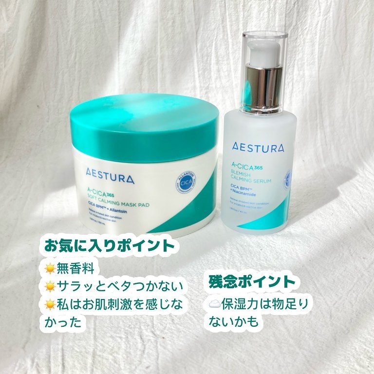 AESTURAエイシカ365マイクロセラム/クイックマスクパッド肌の鎮静、保湿、バリア機能のサポートに特化した2アイテム!セラムは乾燥によるくすみや肌荒れをケアし、「瞬間処方セラム」と呼ばれるほど角質層への浸透力が高いそう。軽いテクスチャーで...