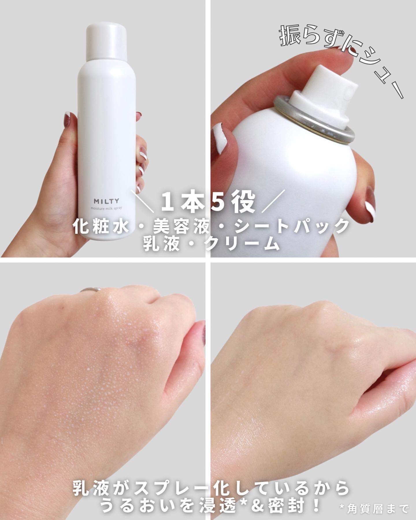 日本初の乳液ミストスプレーでスキンケア完了! ナリスアップ ミルティー モイスチャーミルクスプレー 化粧水・美容液・シートパック・乳液・クリームがこれ1本でケアできる! 3秒でスキンケア出来る最高なオールインワンスプレーです👏🏻👏🏻👏🏻 疲れきってる時や忙しい時に頑張ってスキンケアするより、これ1本ですませてしまった方が肌の調子がいいです🤭︎💕