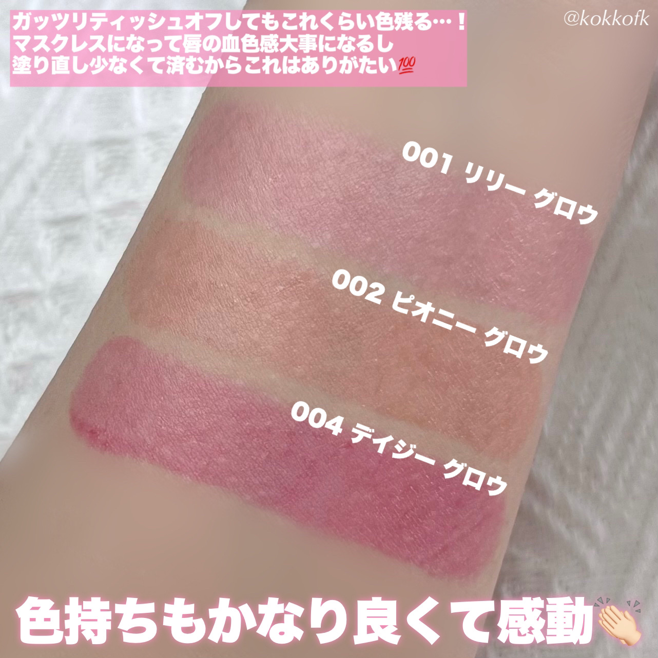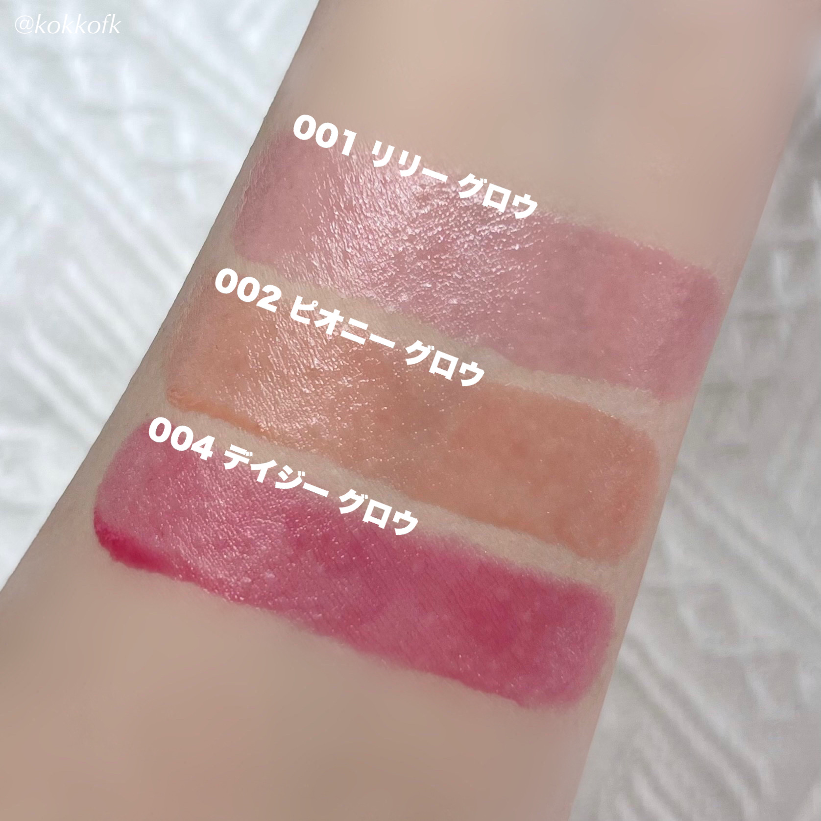 - <001 リリー グロウ> トリ(カプリル酸/カプリン酸)グリセリル、ポリブテン、トリメリト酸トリイソデシル、ミツロウ、ポリエチレン、オゾケライト、リン酸2Ca、リンゴ酸ジイソステアリル、ポリヒドロキシステアリン酸、スクワラン、シア脂、テトラ(ジ-t-ブチルヒドロキシヒドロケイヒ酸)ペンタエリスリチル、BG、香料、クエン酸、リナロール [+/-] 酸化チタン、赤104(1)、赤201、赤202、赤218、赤223、橙201、黄4、青1 <002 ピオニー グロウ> トリ(カプリル酸/カプリン酸)グリセリル、ポリブテン、トリメリト酸トリイソデシル、ミツロウ、ポリエチレン、オゾケライト、リン酸2Ca、リンゴ酸ジイソステアリル、ポリヒドロキシステアリン酸、スクワラン、シア脂、テトラ(ジ-t-ブチルヒドロキシヒドロケイヒ酸)ペンタエリスリチル、BG、香料、クエン酸、リナロール [+/-] 酸化チタン、赤104(1)、赤201、赤202、赤218、赤223、橙201、黄4、青1 <003 マグノリア グロウ> トリ(カプリル酸/カプリン酸)グリセリル、ポリブテン、トリメリト酸トリトリデシル、ミツロウ、ポリエチレン、オゾケライト、リン酸2Ca、スクワラン、シア脂、リンゴ酸ジイソステアリル、ポリヒドロキシステアリン酸、BG、クエン酸、テトラ(ジ-t-ブチルヒドロキシヒドロケイヒ酸)ペンタエリスリチル、香料、リナロール [+/-] 酸化チタン、赤104(1)、赤201、赤223、橙201、青1 <004 デイジー グロウ> トリ(カプリル酸/カプリン酸)グリセリル、ポリブテン、トリメリト酸トリイソデシル、ミツロウ、ポリエチレン、オゾケライト、リン酸2Ca、リンゴ酸ジイソステアリル、ポリヒドロキシステアリン酸、スクワラン、シア脂、テトラ(ジ-t-ブチルヒドロキシヒドロケイヒ酸)ペンタエリスリチル、BG、香料、クエン酸、リナロール [+/-] 酸化チタン、赤104(1)、赤201、赤202、赤218、赤223、橙201、黄4、青1 <005 チューリップ グロウ> トリ(カプリル酸/カプリン酸)グリセリル、ポリブテン、トリメリト酸トリトリデシル、ミツロウ、ポリエチレン、オゾケライト、リン酸2Ca、スクワラン、シア脂、リンゴ酸ジイソステアリル、ポリヒドロキシステアリン酸、BG、クエン酸、テトラ(ジ-t-ブチルヒドロキシヒドロケイヒ酸)ペンタエリスリチル、香料、リナロール [+/-] 酸化チタン、硫酸Ba、赤104(1)、赤201、赤202、赤218