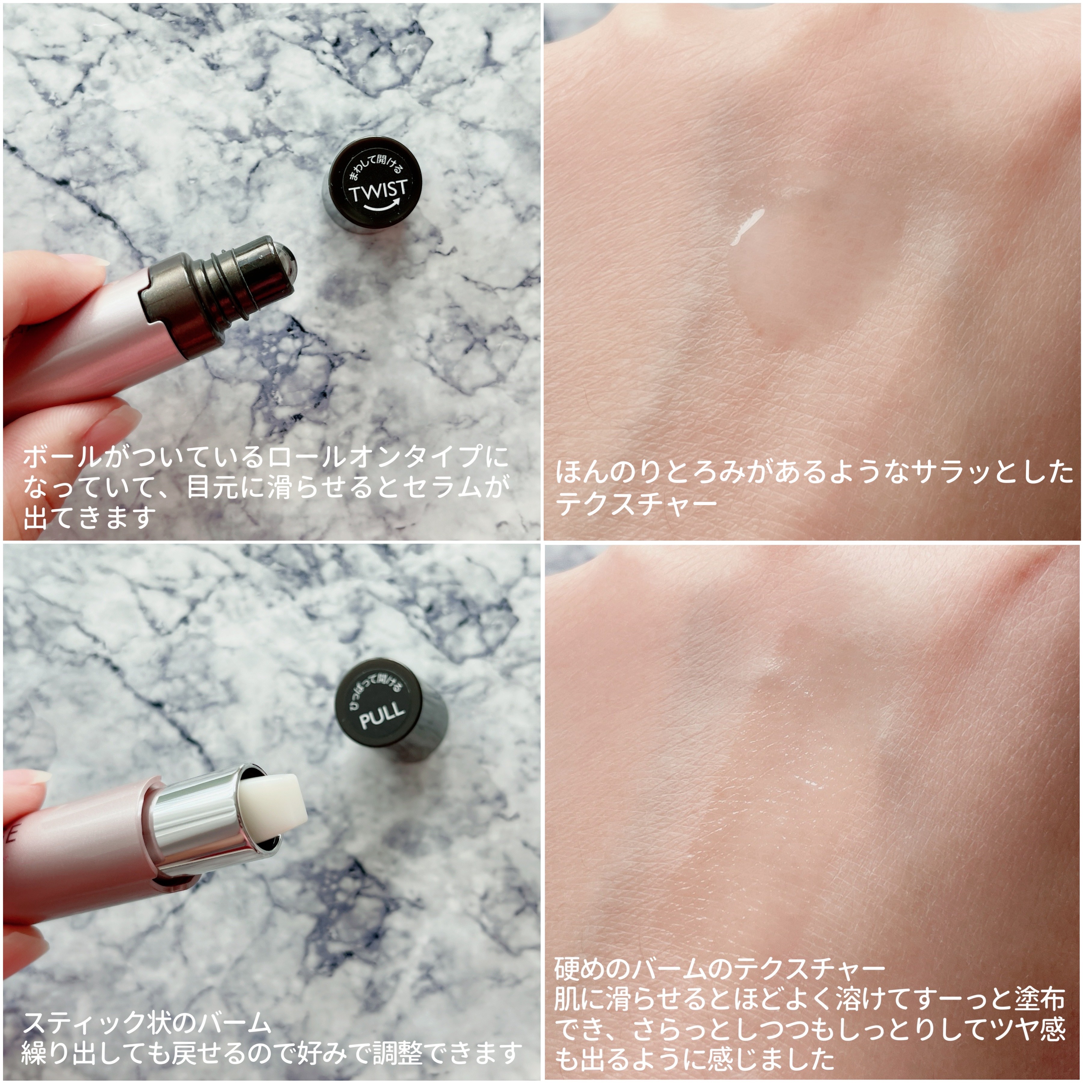 複合的な目もと悩みにアプローチするために、第一三共ヘルスケアが開発✦* セラムとバーム”2in1”スティックで艶めくハリ感を目もとに! セラムとバームの2ステップで完成する「シールドベール」 セラムとバームが重なることで、肌表面にツヤのある被膜「シールドベール」を形成。 セラムはとろみのあるテクスチャーです。 コロコロするだけで、ひんやり気持ち良い◎ スッキリとします✦*