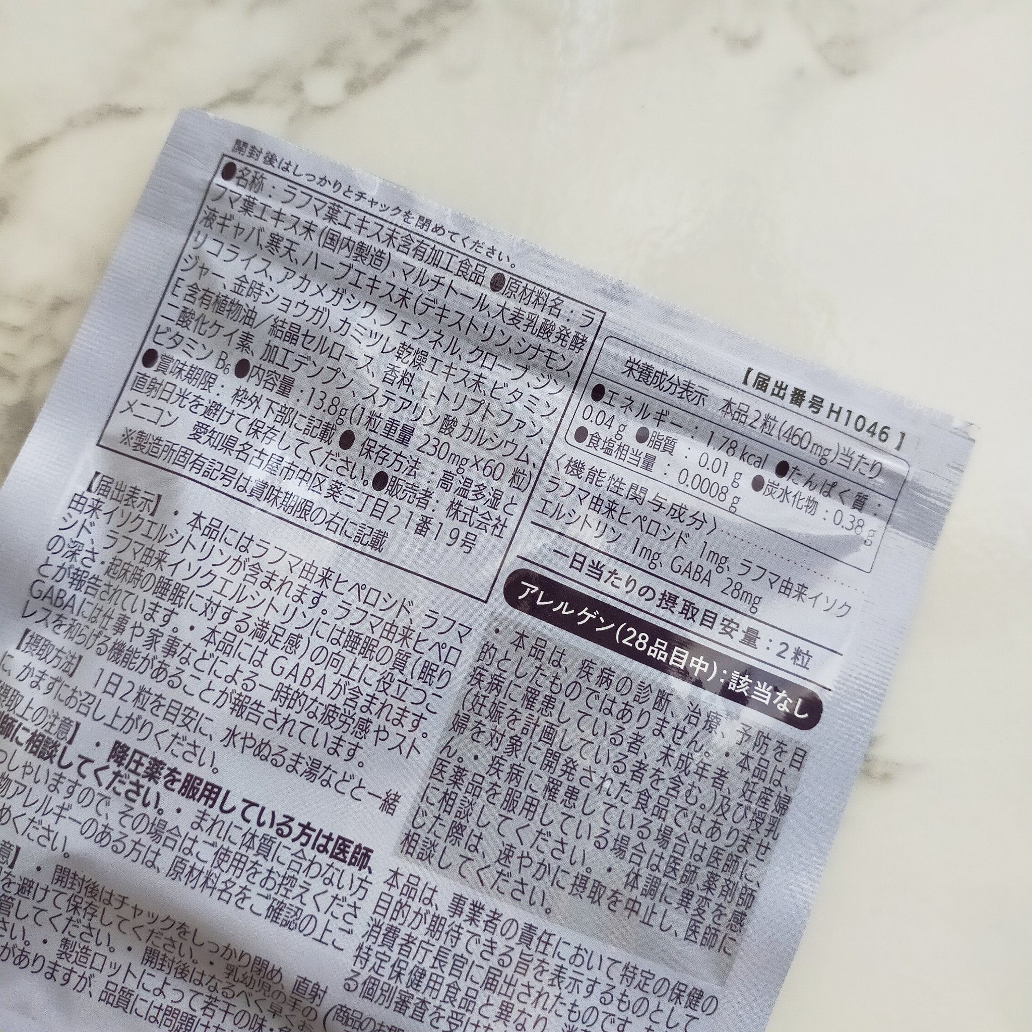 ラフマ由来ヒペロシド、ラフマ由来イソクエルシトリンには睡眠の質(眠りの深さ・起床時の睡眠に対する満足感)の向上に役立つことが報告されていて、 またGABAも含まれています。GABAには仕事や家事などによる一時的な疲労感やストレスを和らげる機能があることが報告されています。 1日摂取目安が2粒で小粒なので手軽に服用出来ました。 いつ飲めばいいかの記載はなかったので、寝る前に飲んでいます。