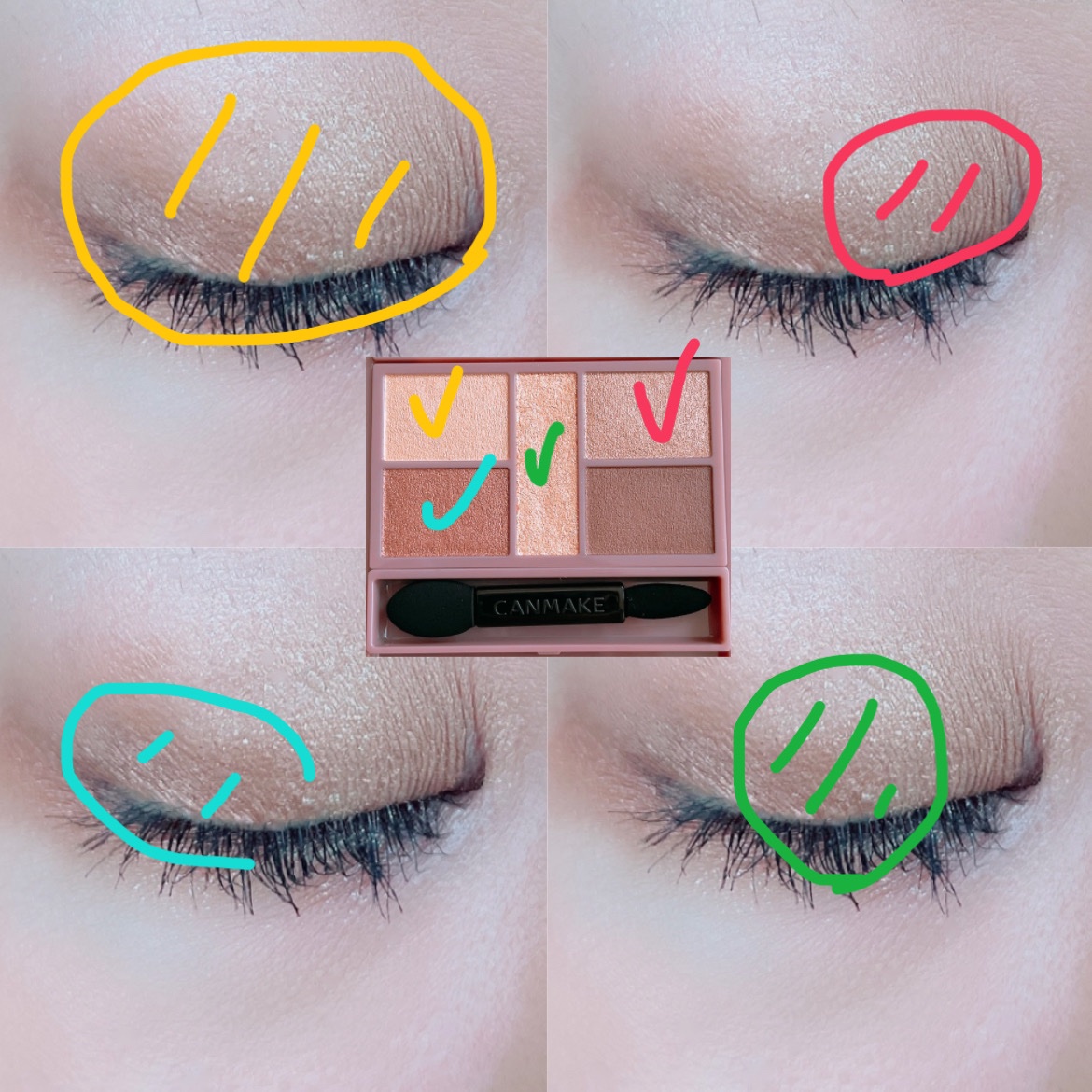 - 1枚のパレットで2つのスタイルが完成! 5色の欲ばりアイシャドウ♥ メインカラーを選んで2つのスタイルが楽しめる! A→B→D でスタイル1 A→C→D でスタイル2 繊細な粉質が、しっとりとまぶたに密着して色落ちを防ぎます。 透明感のあるキラうるトッピングジュエル(繊細ラメ)は、気分によってトッピング!