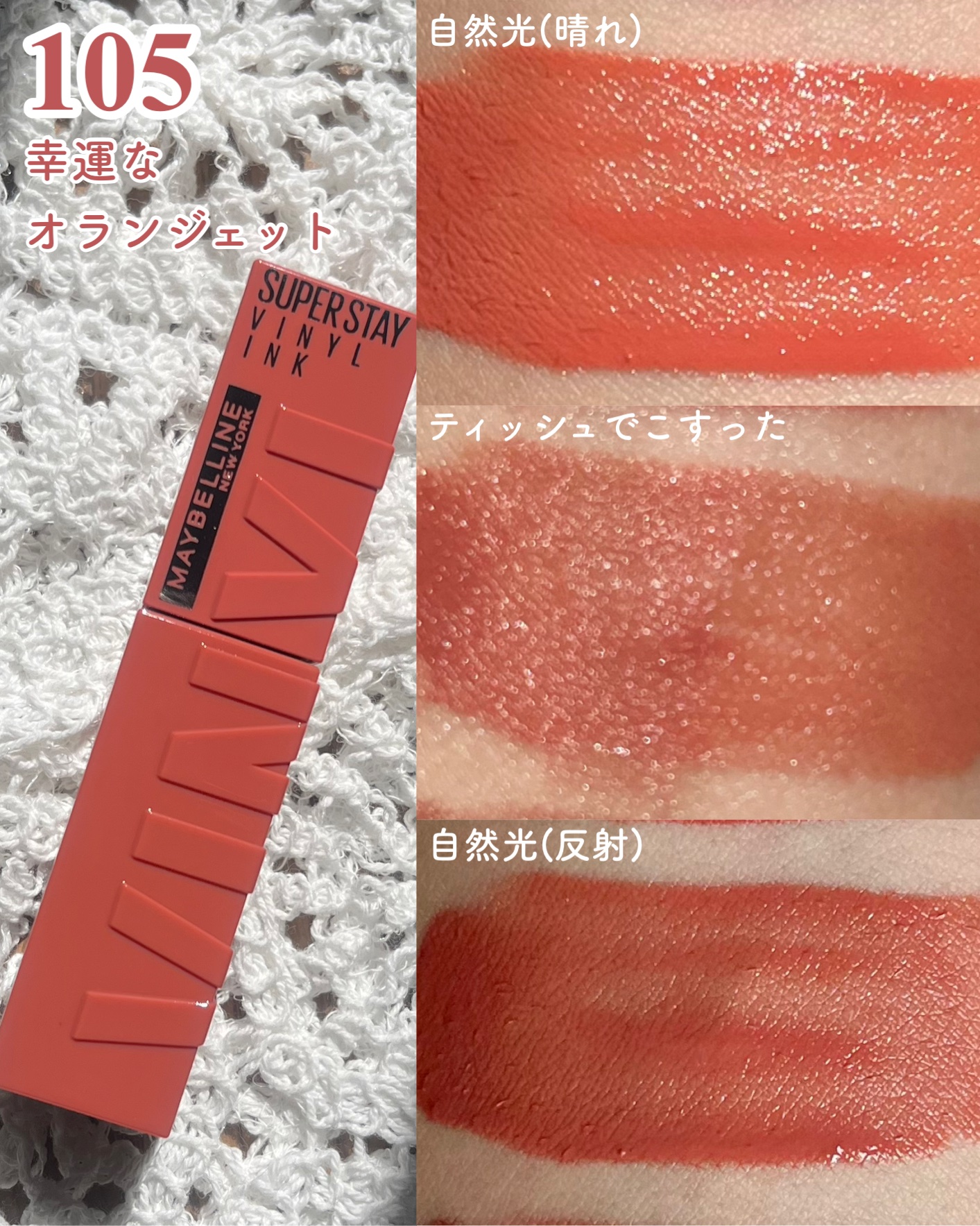 - メイベリン人気No.1リップ からツヤタイプついに誕生!*1 シャカシャカ振って!#落ちないリップ*2 色・ツヤ・仕上がり、全てロック。 〈製品特徴〉 ①シャカシャカ振って、長持ち効果! 膜形成成分*3と高濃度ピグメント*4の2層構造。 シャカシャカ振ると膜形成成分*3と高濃度ピグメント*4が混ざり、 色、ツヤ、仕上がりの長持ち効果! ②色もツヤも落ちない! 最長16時間続く、#落ちないリップ*2 メイベリン独自のトリプルロックフォーミュラ。色・ツヤ・仕上がり、全てロック。 食べても、飲んでも、塗りたての仕上がりが落とすまで続く。*2 ③濃密な発色とツヤをひと塗りで。 塗った瞬間、ムラなく発色。 顔色まで明るくトーンアップするような仕上がりに。*5 ④唇を包み込み、うるおい感ある仕上がりに。 乾燥しにくく、一日中*6心地良い仕上がりに。 塗った瞬間、唇をふっくらとみせ、縦じわが目立ちにくい。 *1:インテージSRI+調べ。2018年9月~2022年7月までのスーパー、ドラッグストア等におけるメイベリン ニューヨーク リップカテゴリーでの売上金額に基づく。 *2:着用16時間を想定した最長の場合において。メイクアップリムーバーで落とすことが可能です。メイベリン ニューヨーク調べ。個人差があります。 *3:トリメチルシロキシケイ酸、ポリプロピルシルセスキオキサン、アルキル(C30-45)ジメチルシリルポリプロピルシルセスキオキサン、ポリメチルシルセスキオキサン/トリメチルシロキシケイ酸。 *4:メイベリン従来品(ウォーター シャイニー ボリューミー パール)と比較において、3倍のピグメントを配合 *5:メイクアップ効果 *6:メイベリン ニューヨーク調べ。個人差があります。